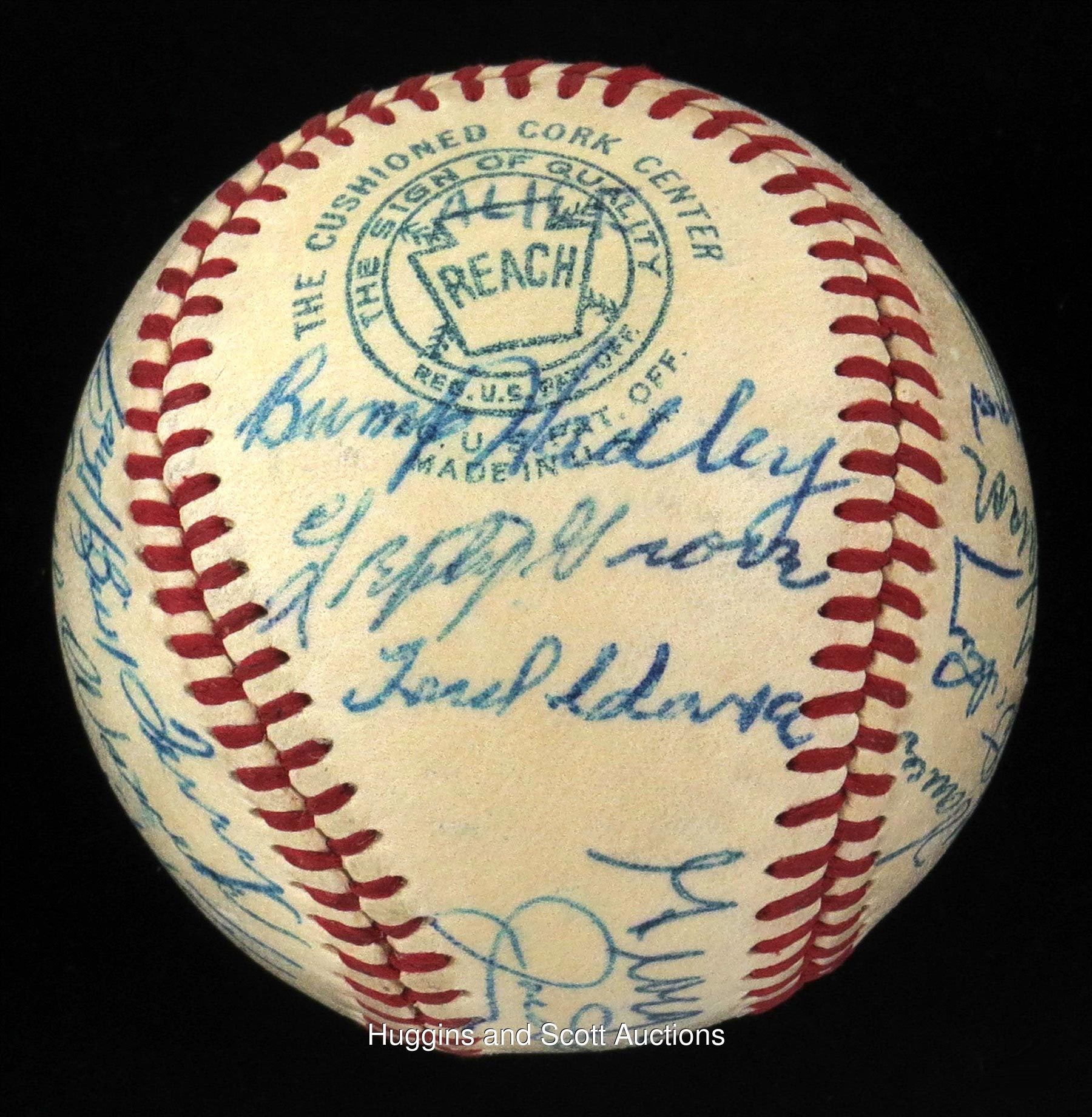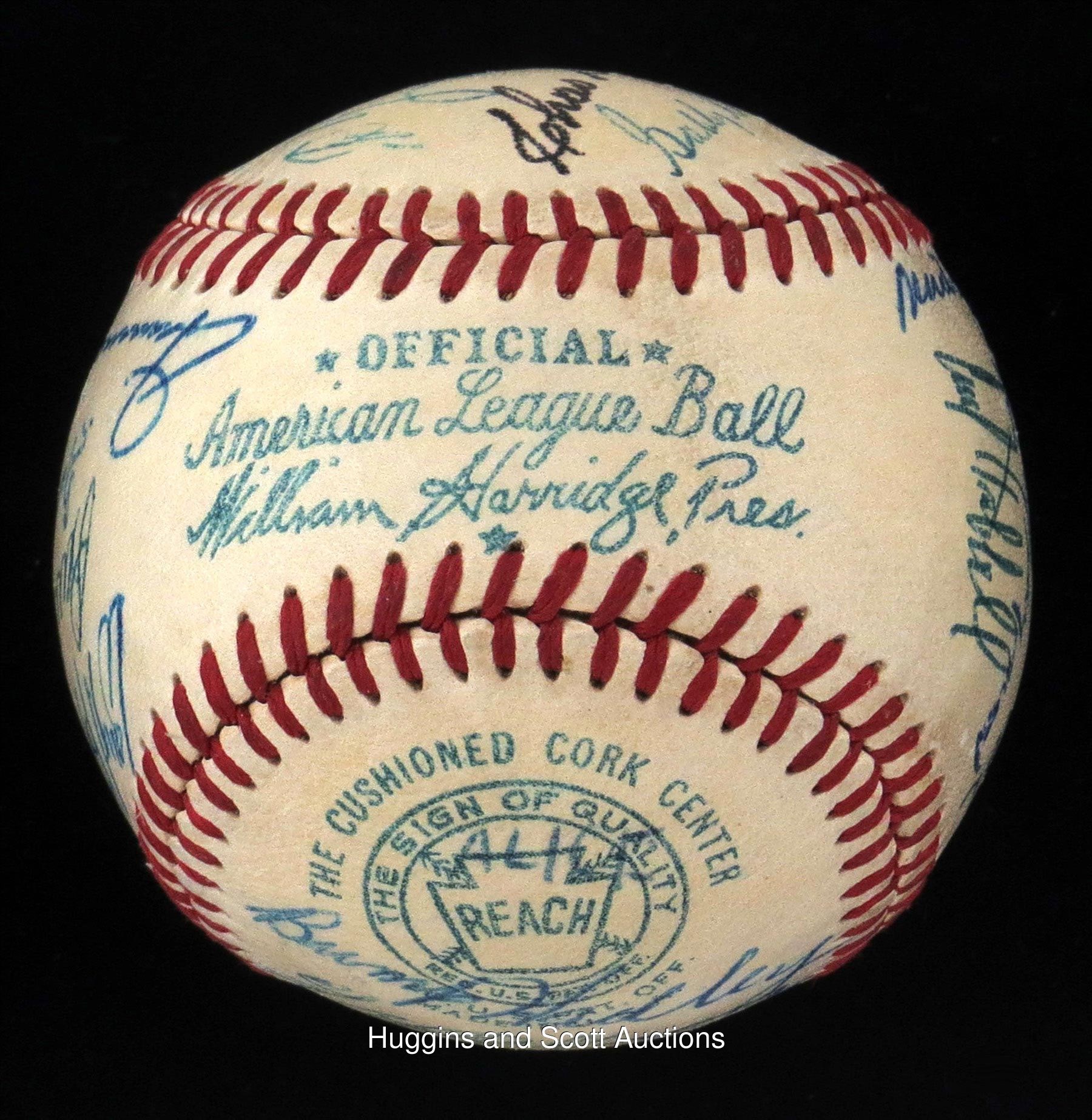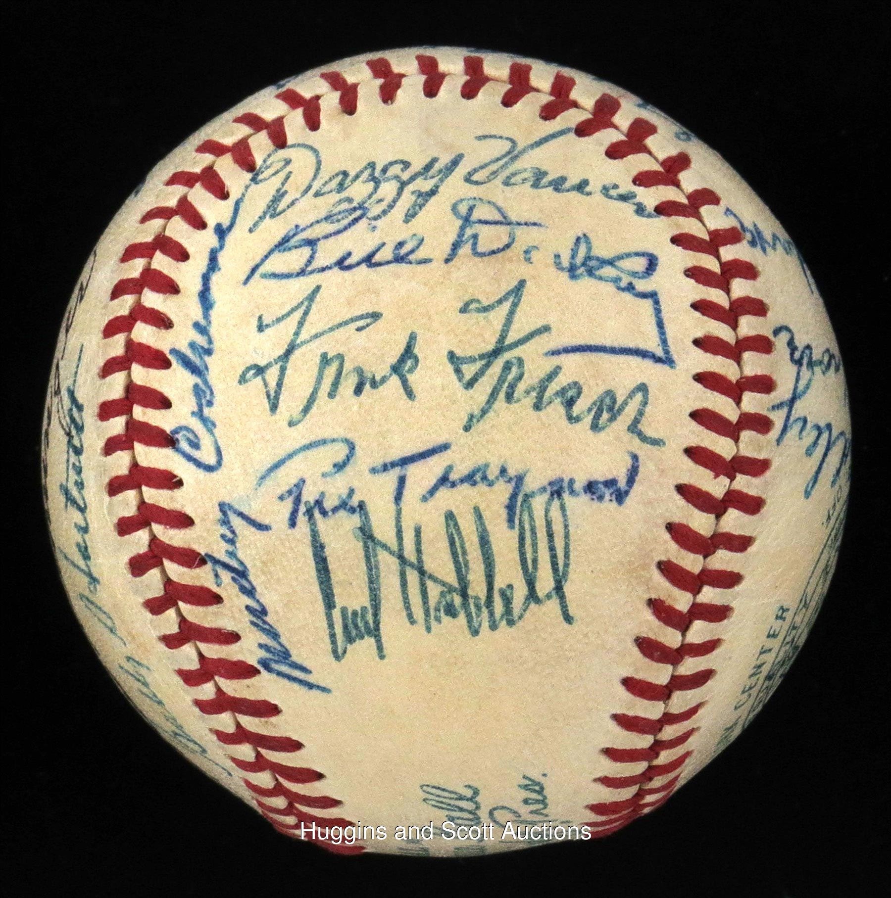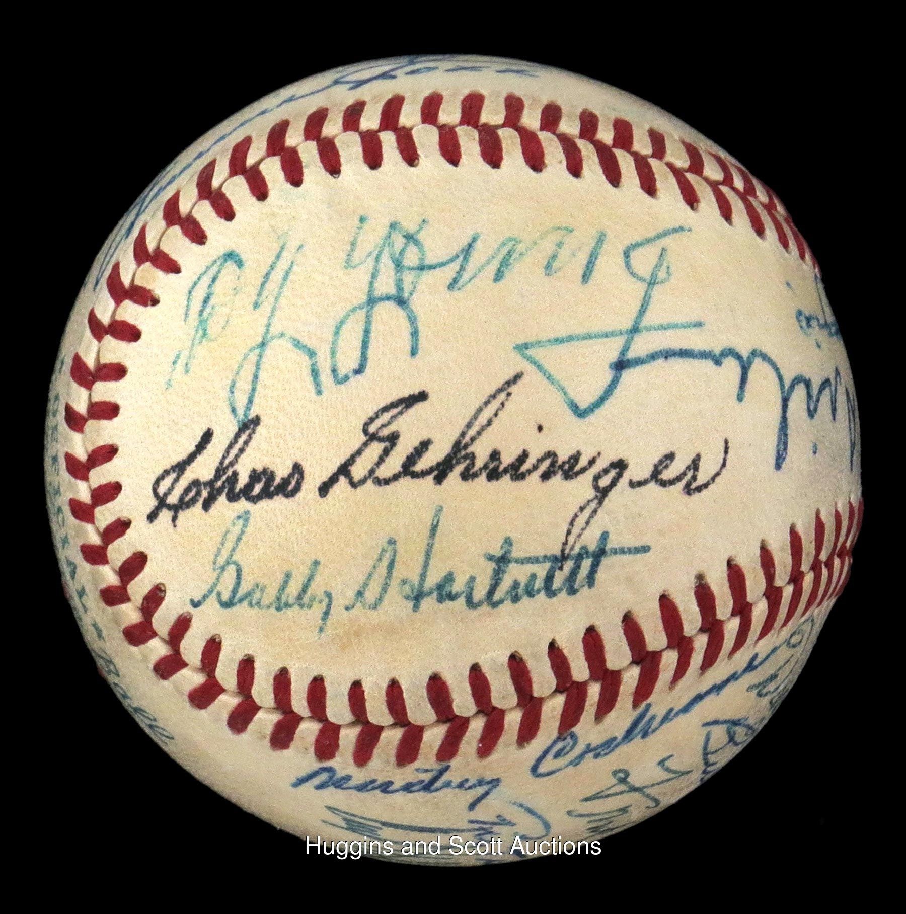 With the largest Hall of Fame class and biggest crowd since 1939, Cooperstown opened its arms to 6 new inductees, including the great Joltin" Joe. (A brief news clip of induction-ceremony footage can be viewed on our website.) The festivities also marked the very last of many Hall of Fame appearances by Cy Young, whose autograph is present here but who died a few months later. The creamy-toned OAL (Harridge) ball features "8-10" signatures overall. Sweet Spot: Sisler, DiMaggio North Panel: Vance, Dickey, Frisch, Traynor, Hubbell, Cochrane South Panel: Terry, P. Waner, Wiltse, Cronin, Foxx ("9-10") West Panel: Hadley, Grove, Clarke ("8"), East Panel: Young ("6-7"), Gehringer, Hartnett Full LOA from PSA.