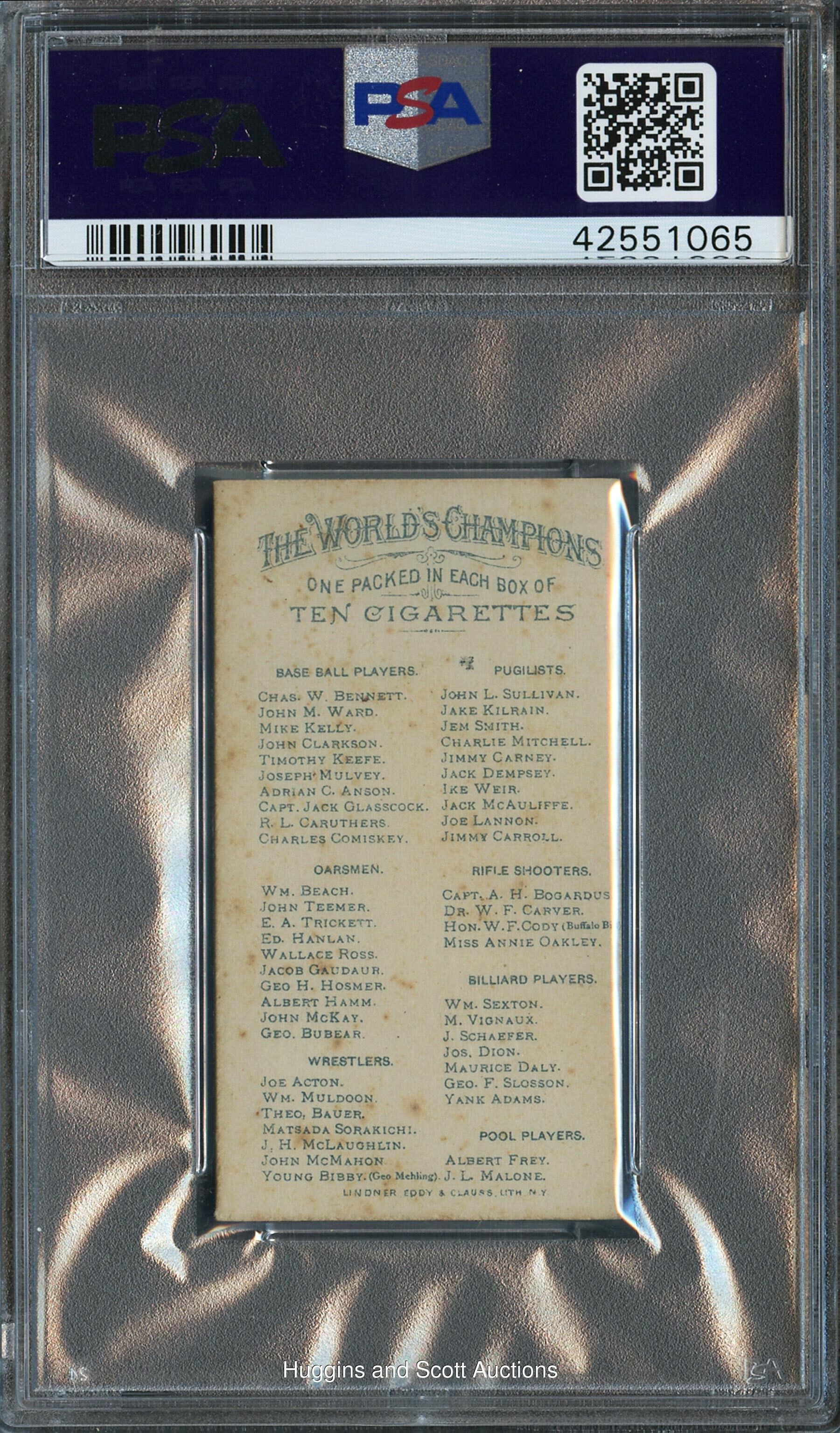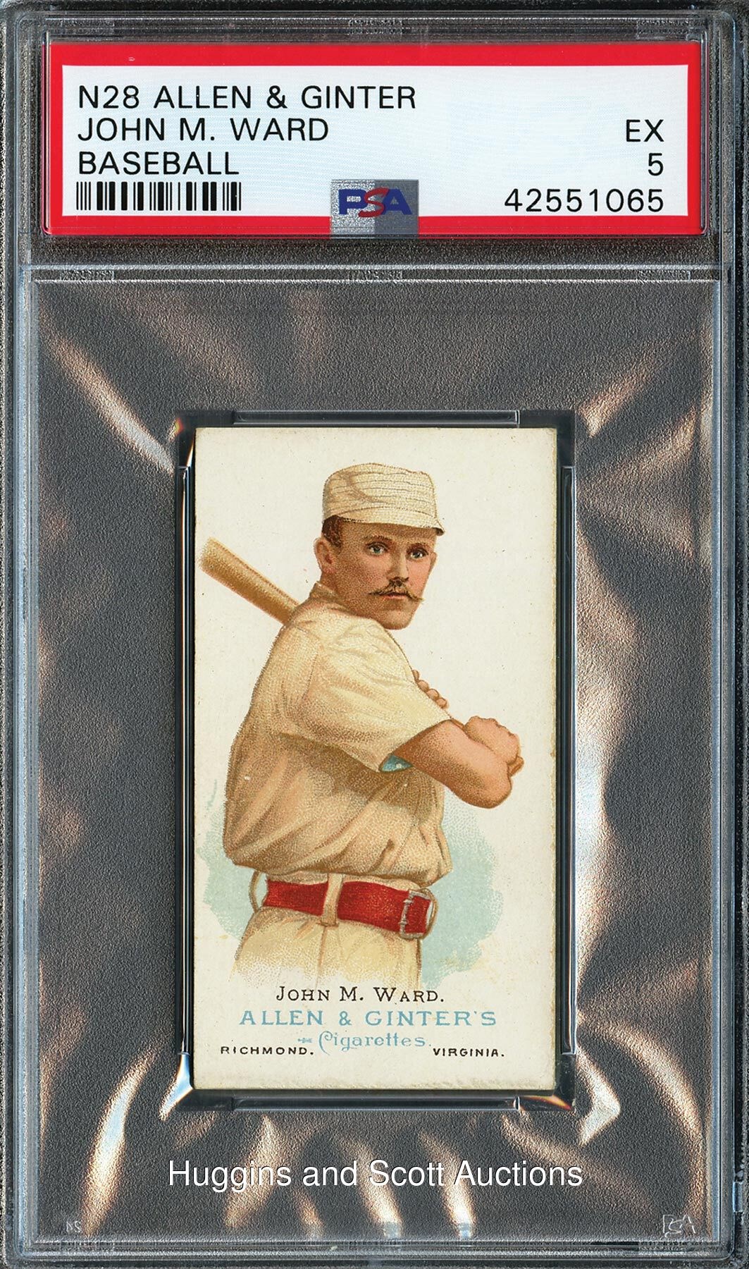 Graded EX 5 by PSA. Player"s League founder John (Monte) Ward stars on his 1888 N28 Allen & Ginter tobacco card. The Class of 1964 Hall of Famer has sustained only moderate perimeter wear. The player rendering showcases perfect contrast and the checklist reverse is unmarked. Part of a PSA graded "Base Ball Players" subset break offered individually in this auction.
