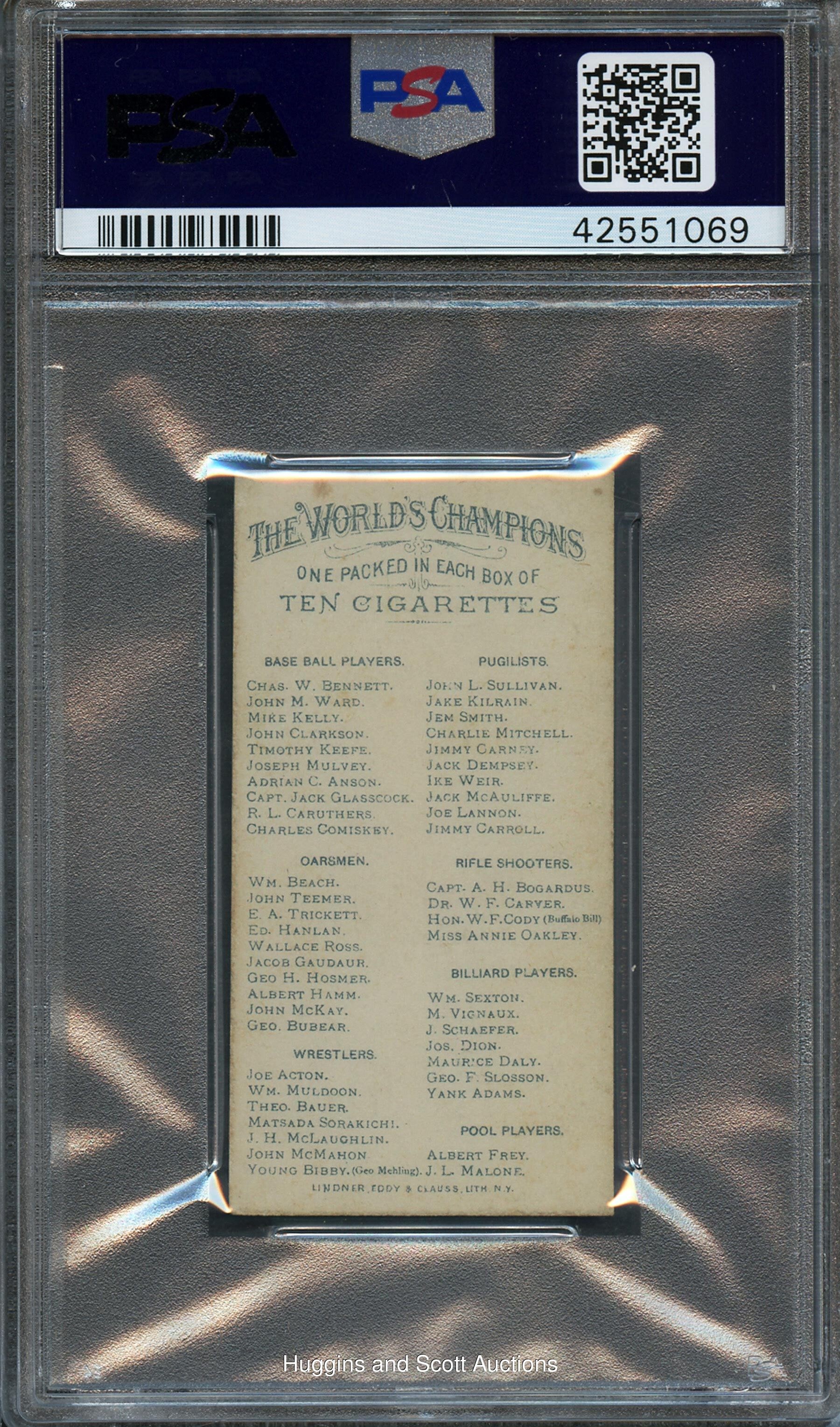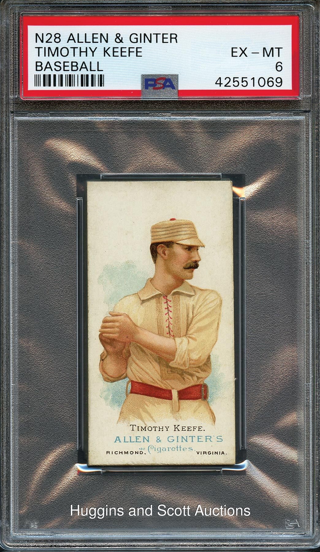 Graded EX-MT 6 by PSA. For 14 playing seasons the mustachioed (Sir) Timothy Keefe stymied opposing batters with his knee-buckling repertoire and amassed 342 career victories. The offered 1888 N28 Allen & Ginter specimen depicts the Hall of Famer at the height of his prowess. This 131 year-old jewel displays four sharp corners, crisp edges, impeccable centering and a perfectly contrasted illustration. The checklist reverse escaped any pencil markings and exhibits bold printing. Part of a PSA graded "Base Ball Players" subset break offered individually in this auction.