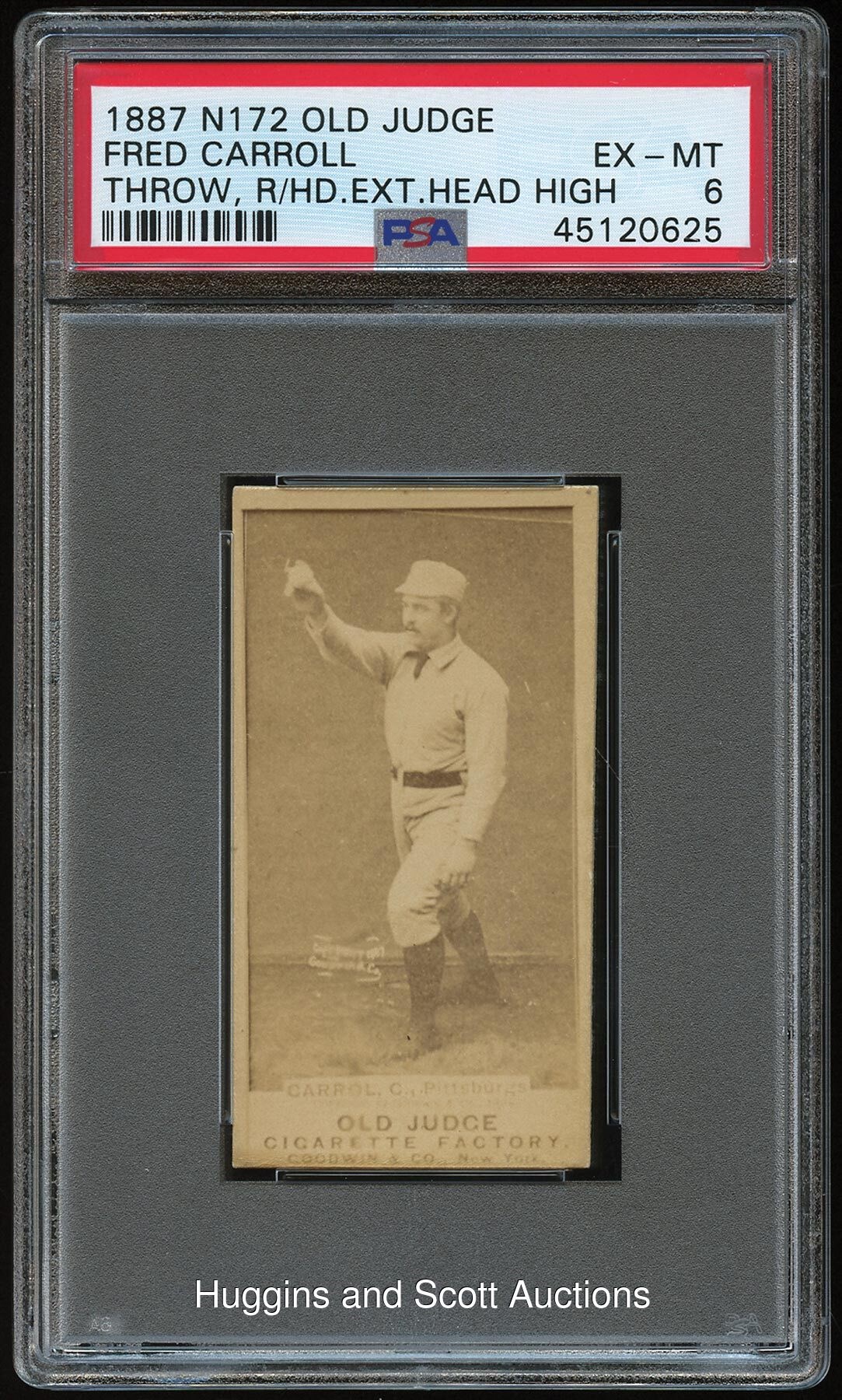 Only Graded of Player/Pose! Graded EX-MT 6 by PSA. Fred Carroll, the young backstop of the Pittsburgh Alleghenys and the first player to hit for the cycle in franchise history is captured on the offered 1887 N172 Old Judge relic. Confirmed as pose #69-1. This crystal clear antique showcases razor-sharp corners, crisp edges and a clean back. It does not get much better for Old Judge die-hards than this 133 year-old single!