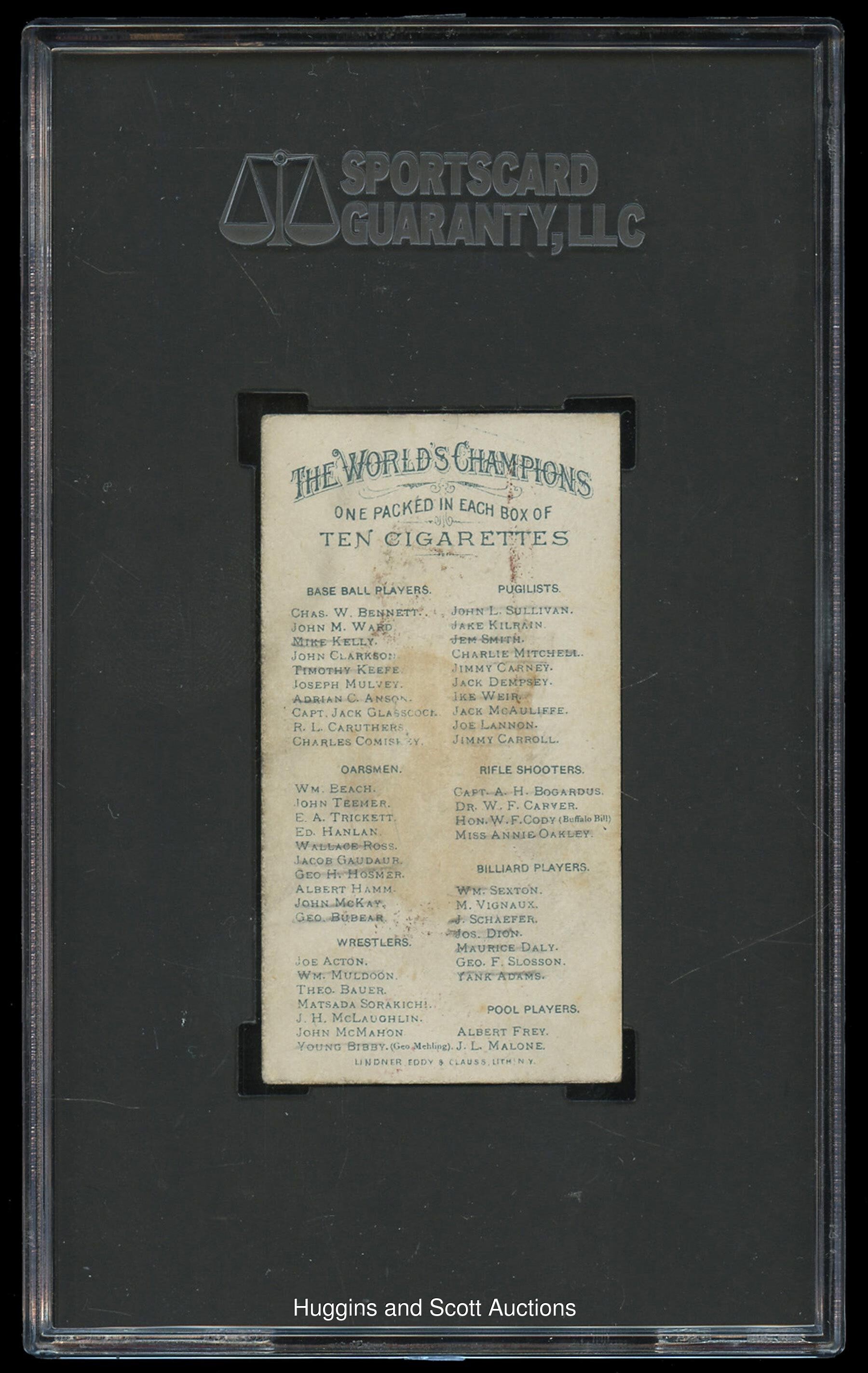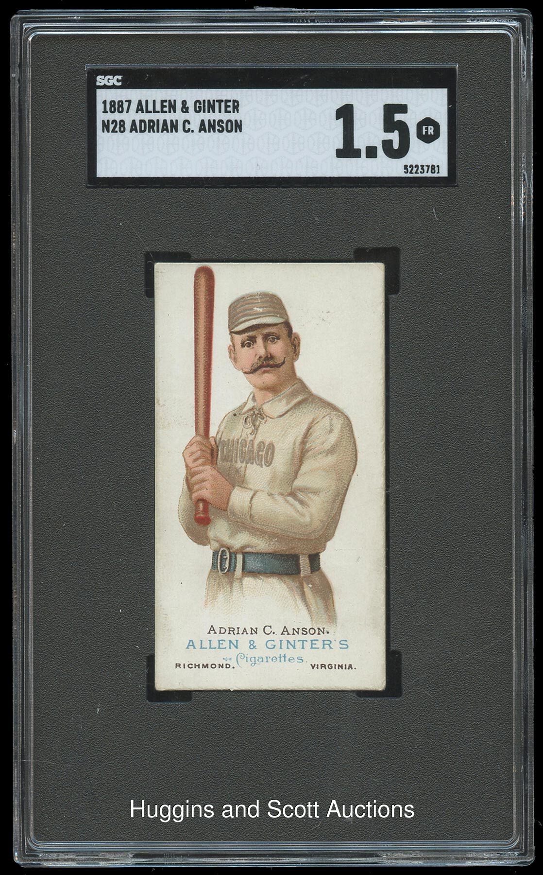The indomitable Adrian (Cap) Anson chokes up on his 1887 N28 Allen & Ginter example. Graded 1.5 Fair by SGC. Despite reverse glue residue on the otherwise clean checklist back, the crease-free front displays a crisp perimeter and bold surface colors.