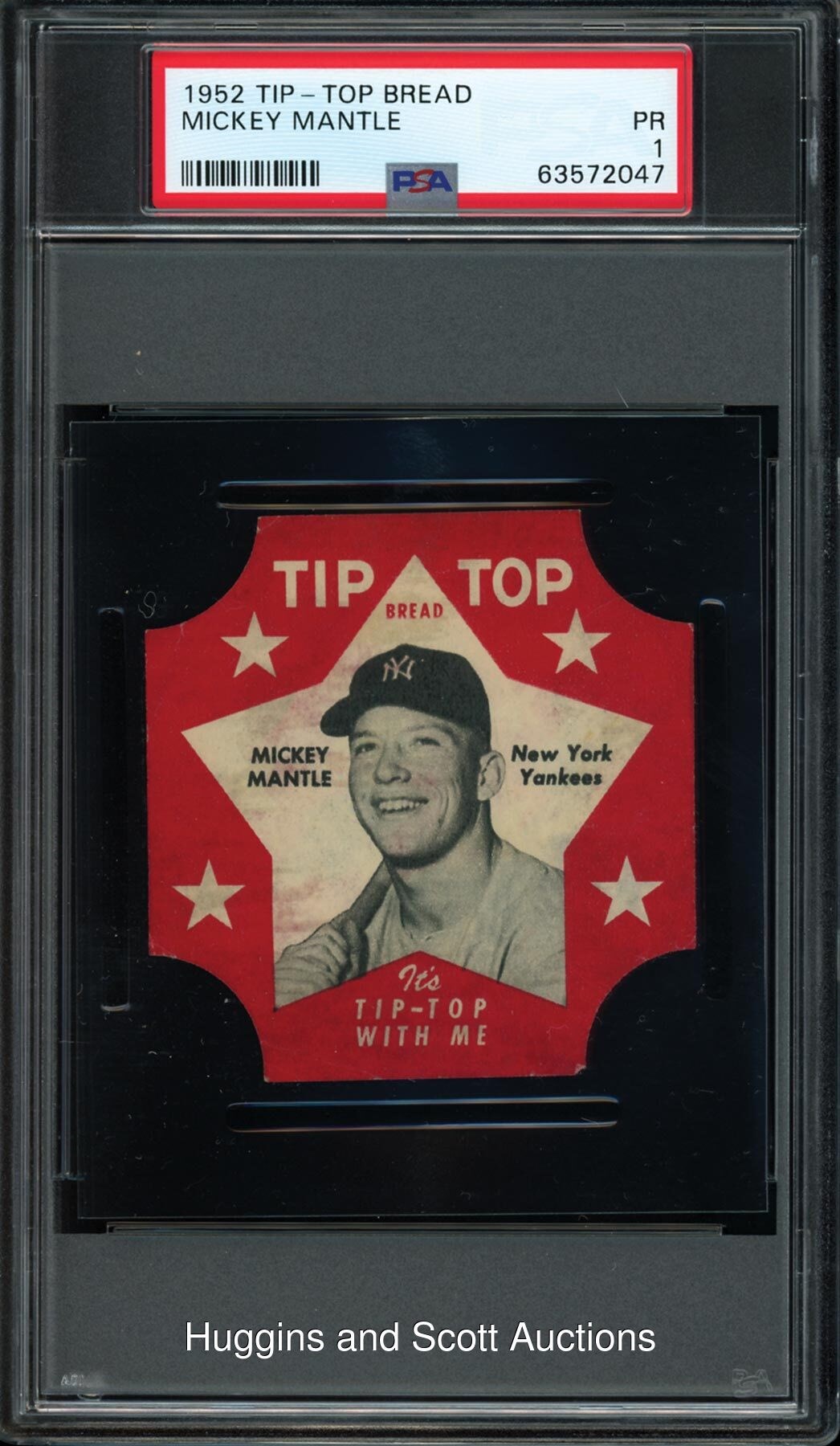 The Holy Grail of Bread Labels! Among the scarcest and most coveted of all early Mickey Mantle relics is the offered 1952 Tip-Top Bread Label. Graded Poor 1 by PSA, only 13 total examples of this ultra-scarce relic have been judged by the third-party authenticator. Printed on wafer-thin printing stock, very few such bread labels survived their initial encounter with hungry grocery consumers. This fragile "new to hobby" keepsake showcases a crisply formed die-cut perimeter that has sustained only the slightest of wear to the eight point endings. The slugger"s smiling cameo is further surrounded by a starburst design and the advertising text declaration. Additionally, reverse packaging frequent to the issue is noticeable on the reverse. While several thousand 1952 Topps "rookie" and 1952 Bowman second-year Mantle cards have surfaced on the secondary market, it is often years between offerings of this seldom encountered cornerstone!
