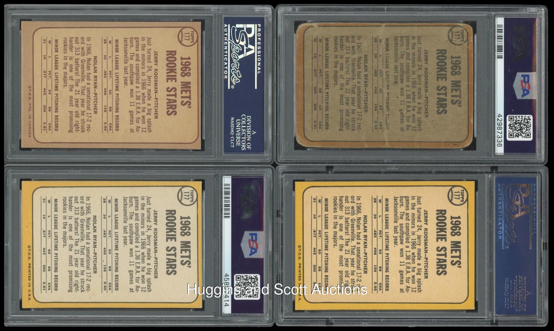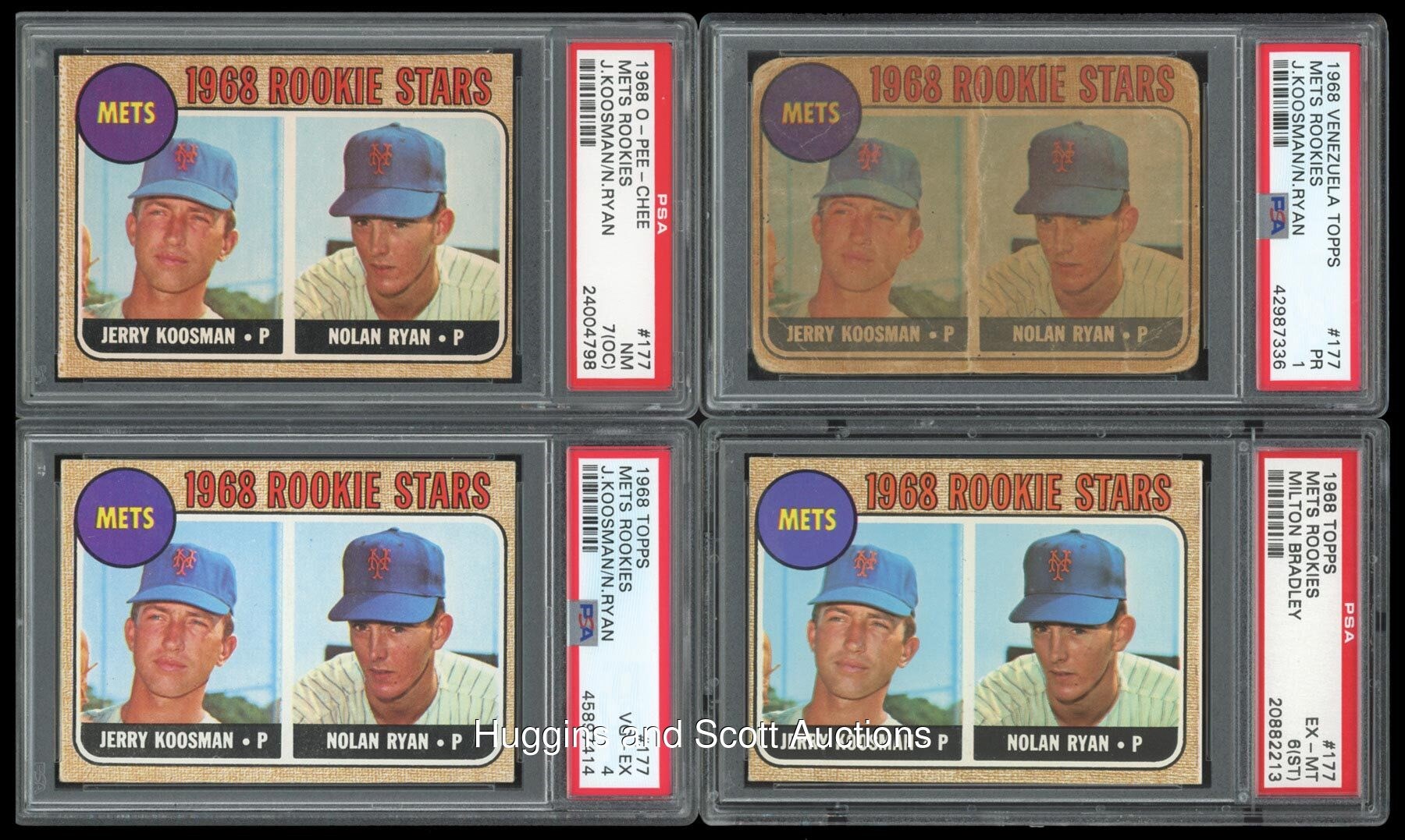 Saddle up for the offered 1968 Nolan Ryan "four horsemen" PSA graded rookie collection of four different cards! Offered as a set for the first time, the recently coined "four horsemen" moniker designates the completion of all four Nolan Ryan rookie cards including the two American versions along with the incredibly tough Canadian and South American parallels. This visually impressive quartet includes the following: 1.) 1968 Topps #177 (PSA VG-EX 4); 2.) 1968 Topps Milton Bradley #177 (PSA EX-MT 6, st); 3.) 1968 O-Pee-Chee #177 (PSA NM 7, oc) and 4.) 1968 Topps Venezuelan (PSA Poor 1). Of particular note, only (37) 1968 Topps Venezuelan #177 Ryan rookies have been evaluated by the major authenticators, meaning there are only scant opportunities for Ryan collectors to secure all four variations. Such cards of the South American version are quite rare and typically found with acute wear and reverse paper loss/residue or writing. This example is absent of any of the latter condition detractors. Additionally, the 1968 O-Pee-Chee #177 Ryan has a confirmed population report of only 2% of the mainstream American issue. Finally, the Milton Bradley parallel from the "Win A Card" board game survives at only 3% of the Topps product. This combination of foreign and domestic Ryan cards represents a standard of collecting achievement and excellence! This item has a reserve. Estimated value ($15,000 - $25,000).