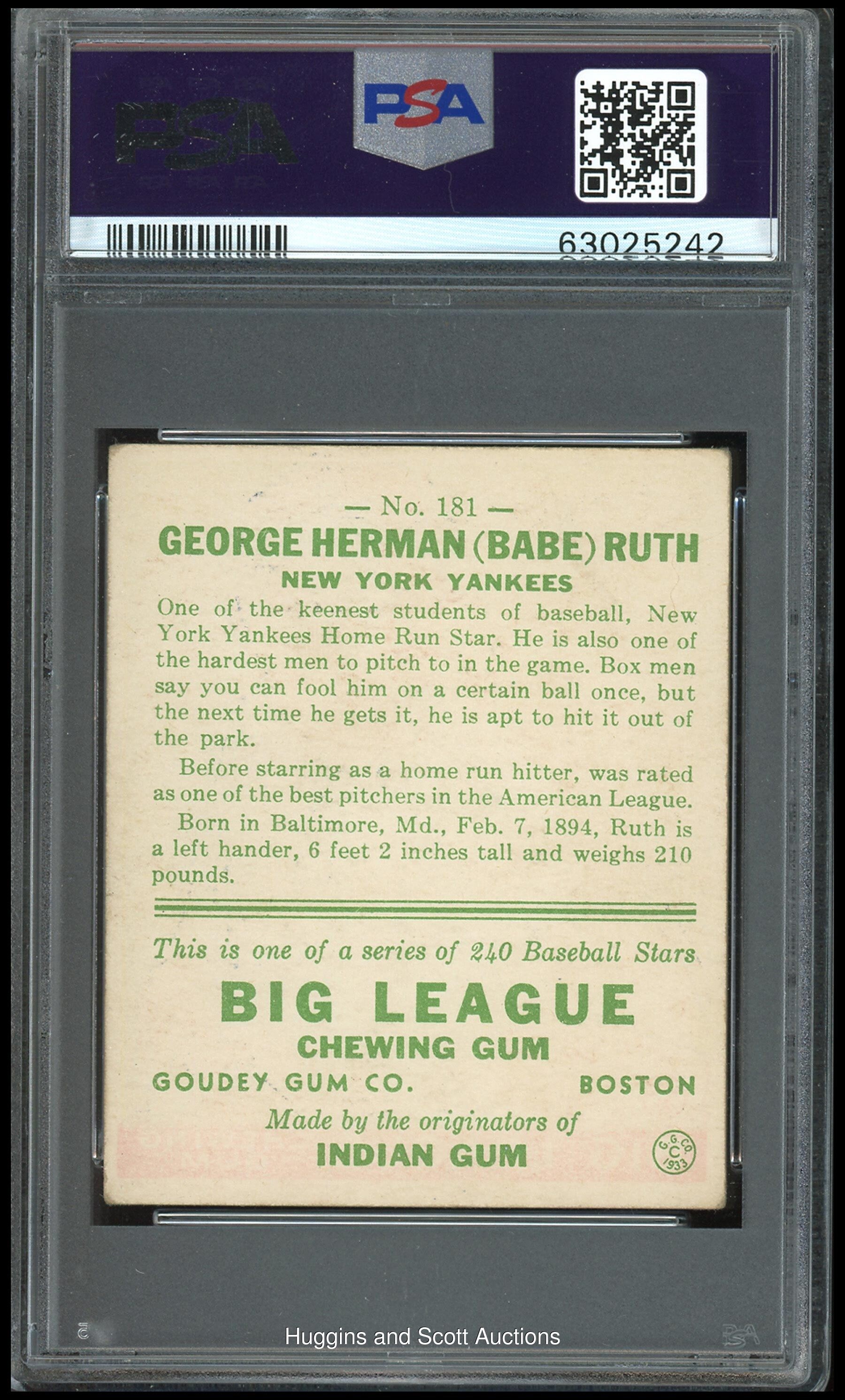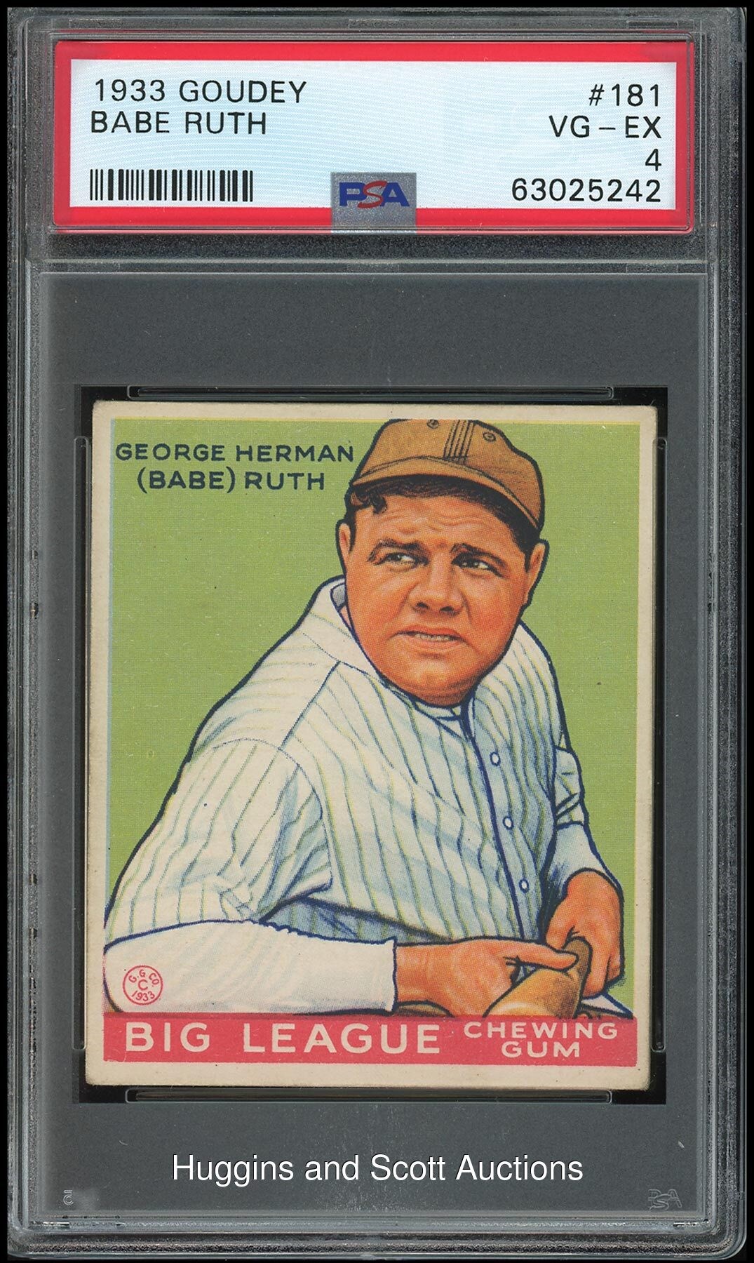 Graded VG-EX 4 by PSA. First owner 1933 Goudey Baseball #181 Babe Ruth with remarkable eye appeal! This crease-free illustration portrays the mighty Ruth holding his lumber of choice while casting a glance toward his right. A sparkling rendition that displays only modest corner/edge wear, creamy edges and crystal clear surface registration. The reverse, which confirms the Maryland native as "one of the keenest students of baseball" is problem-free. Ranks in the upper 20% of all similar Bambinos judged by the authenticator. With the meteoric rise in playing-era Ruth material, this "Big League Chewing Gum" product will certainly achieve spirited bidding interest!