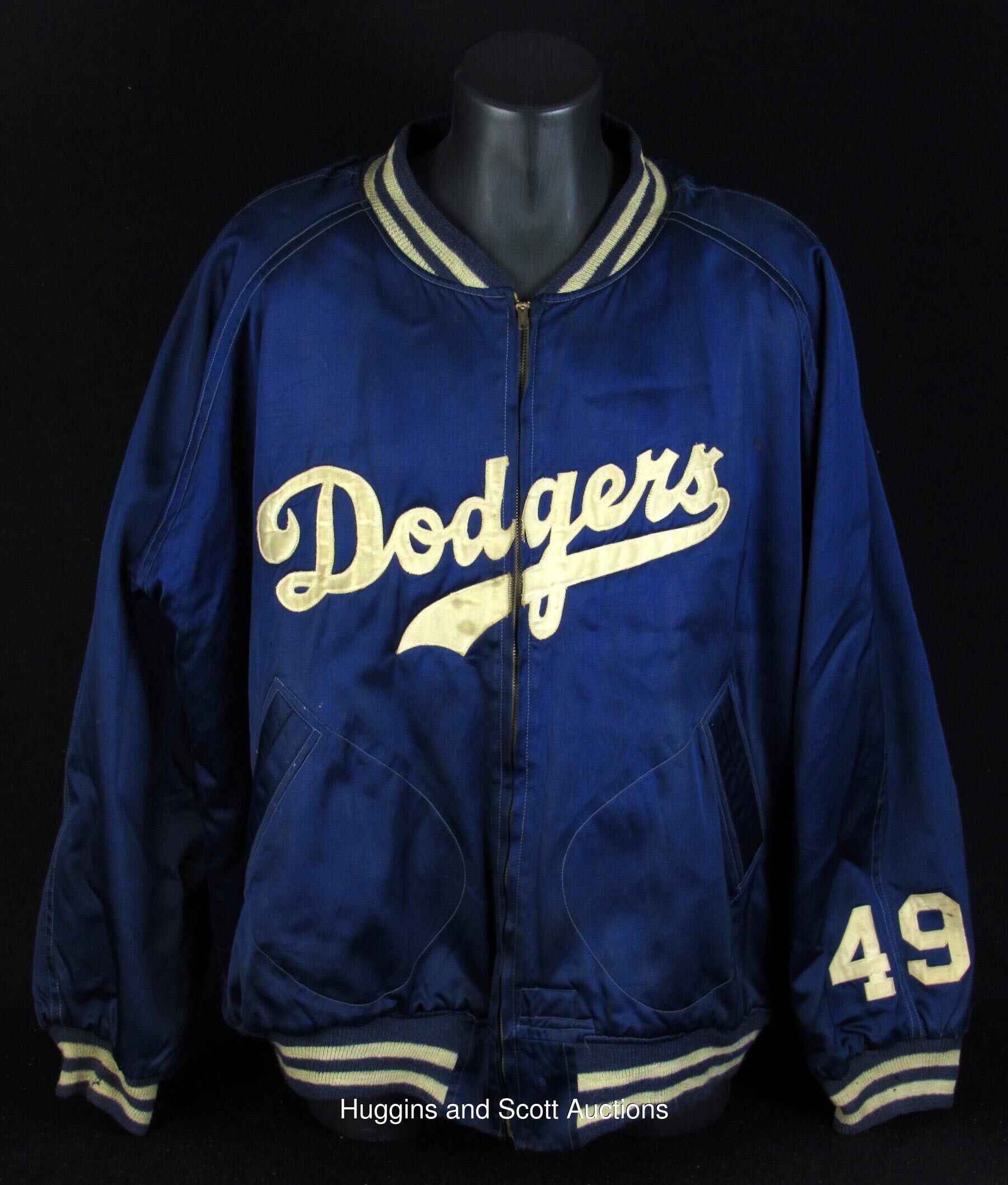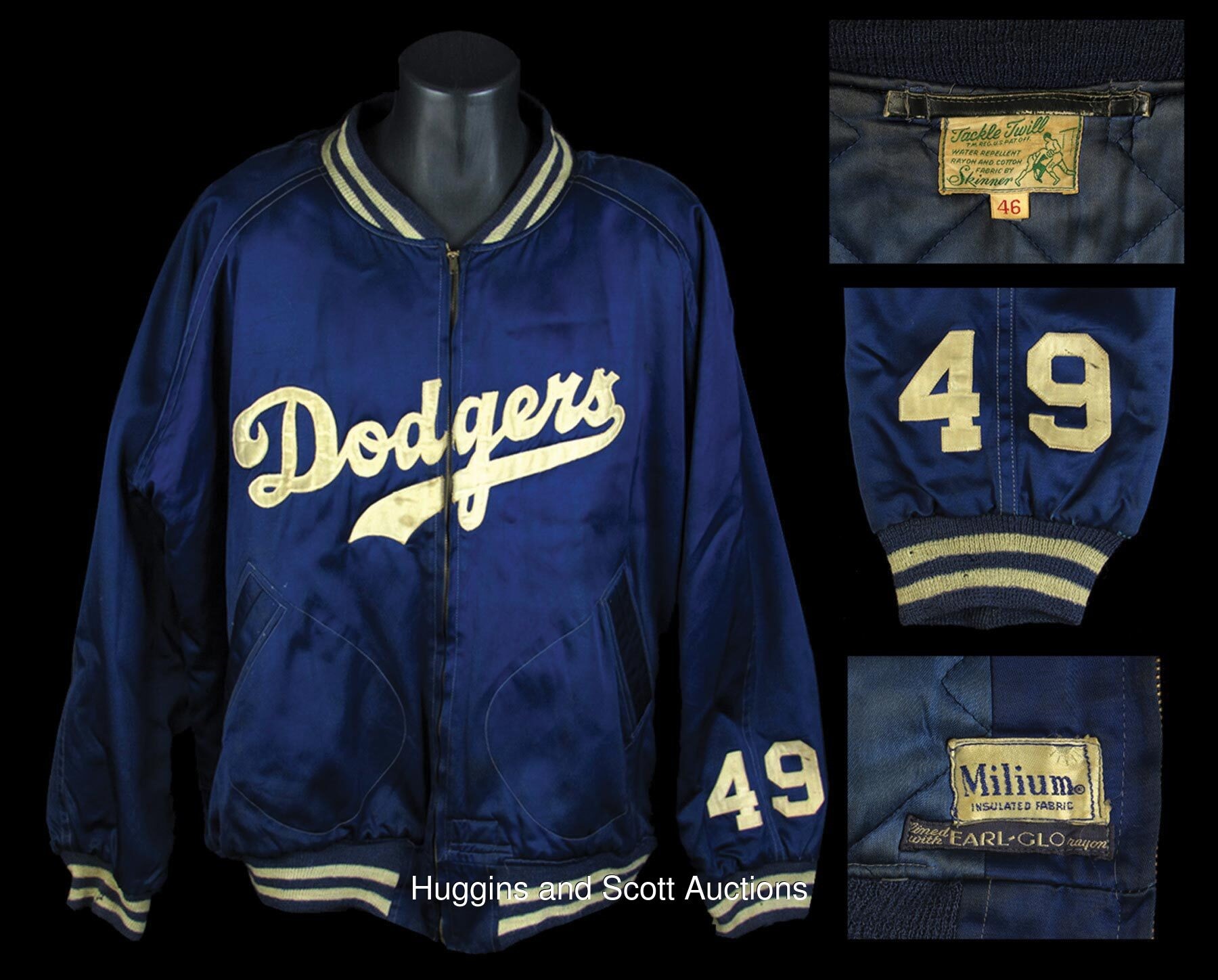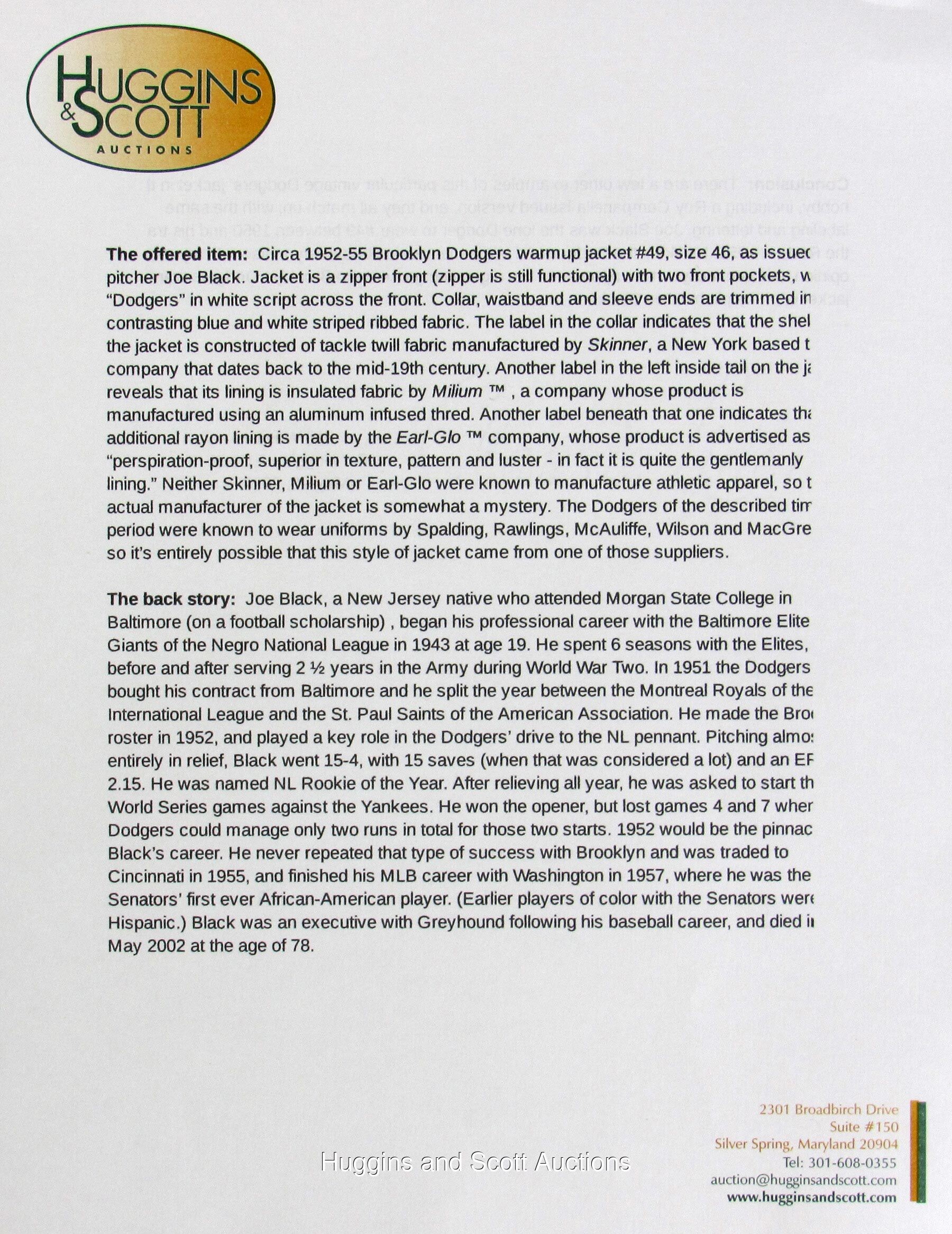 For starters, let"s note that an identical 1950s Brooklyn Dodgers warm-up jacket belonging to Roy Campanella sold at auction for over $70,000 in 2014. Offered here is teammate Joe Black"s jacket, which can be pinpointed to his 1952-55 tenure in Brooklyn. That span included Black"s NL Rookie of the Year campaign, when he posted a 15-4 record with 15 saves, a 2.15 ERA and a league-leading 41 games finished—not to mention a Game 1 win in the "52 World Series. The zipper-up, size-46 jacket distinctively features the prominent numerals of "49" on its left forearm. There are also two front pockets, blue-and-white-striped trim, "Dodgers" across the chest, and manufacturing labels for Skinner (tackle-twill shell), Milium (aluminum-infused insulated lining) and Earl-Glo (rayon lining). As authenticator Phil Wood explains, "Neither Skinner, Milium or Earl-Glo were known to manufacture athletic apparel, so the actual manufacturer of the jacket is somewhat a mystery. The Dodgers of the described time period were known to wear uniforms by Spalding, Rawlings, McAuliffe, Wilson and MacGregor, so it"s entirely possible that this style of jacket came from one of those suppliers." Wood"s analysis concludes, "There are a few other examples of this particular vintage Dodgers jacket in the hobby, including a Roy Campanella-issued version, and they all match up, with the same labeling and lettering. Joe Black was the lone Dodger to wear #49 between 1950 and his trade to the Reds in 1955. It"s likely the Dodgers did not issue new jackets every season. In my expert opinion, this is exactly what it appears to be: a genuine game-worn Brooklyn Dodgers warm-up jacket worn by pitcher Joe Black." EX condition overall. Accompanied by a Joe Black stadium pin.