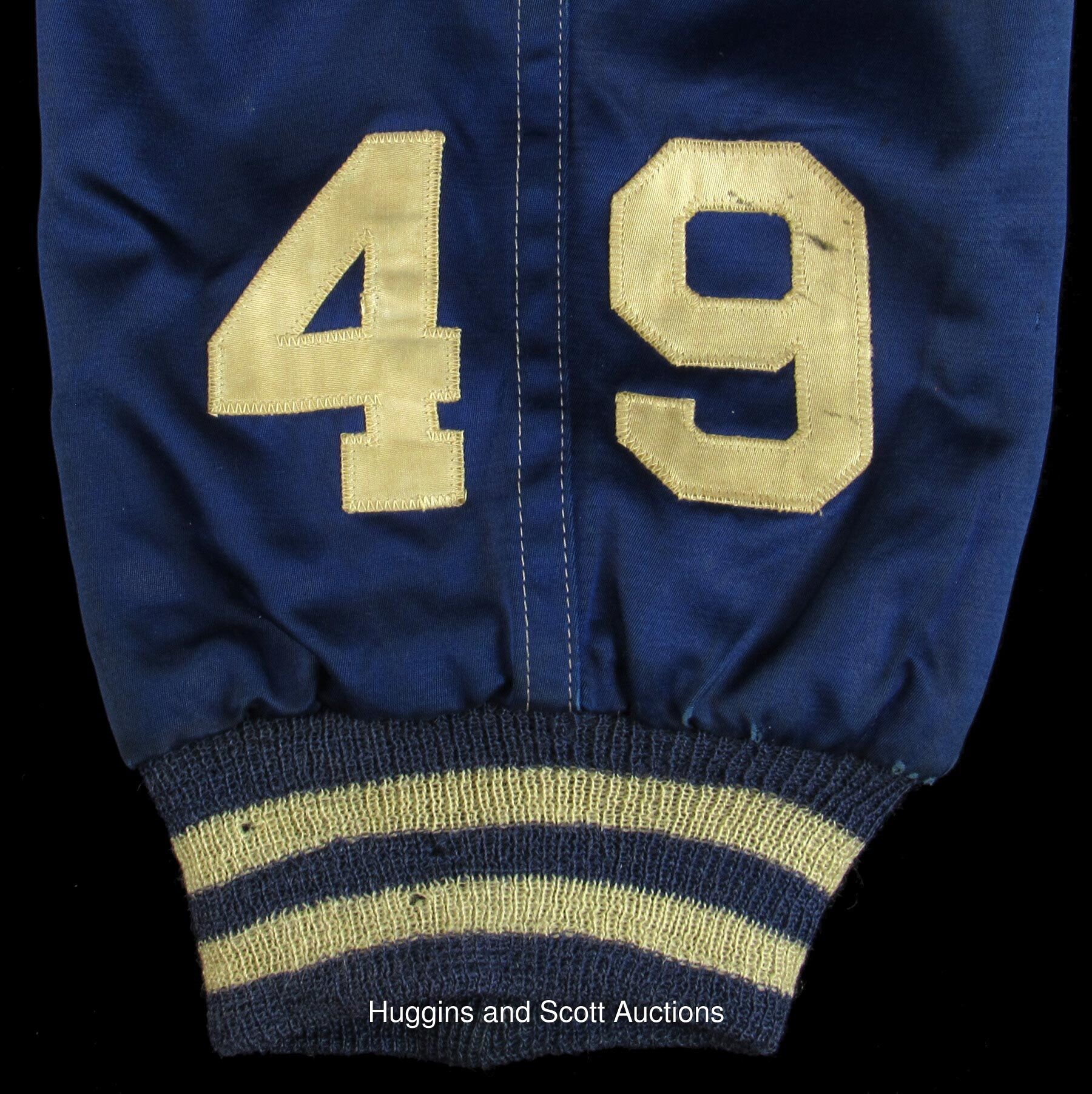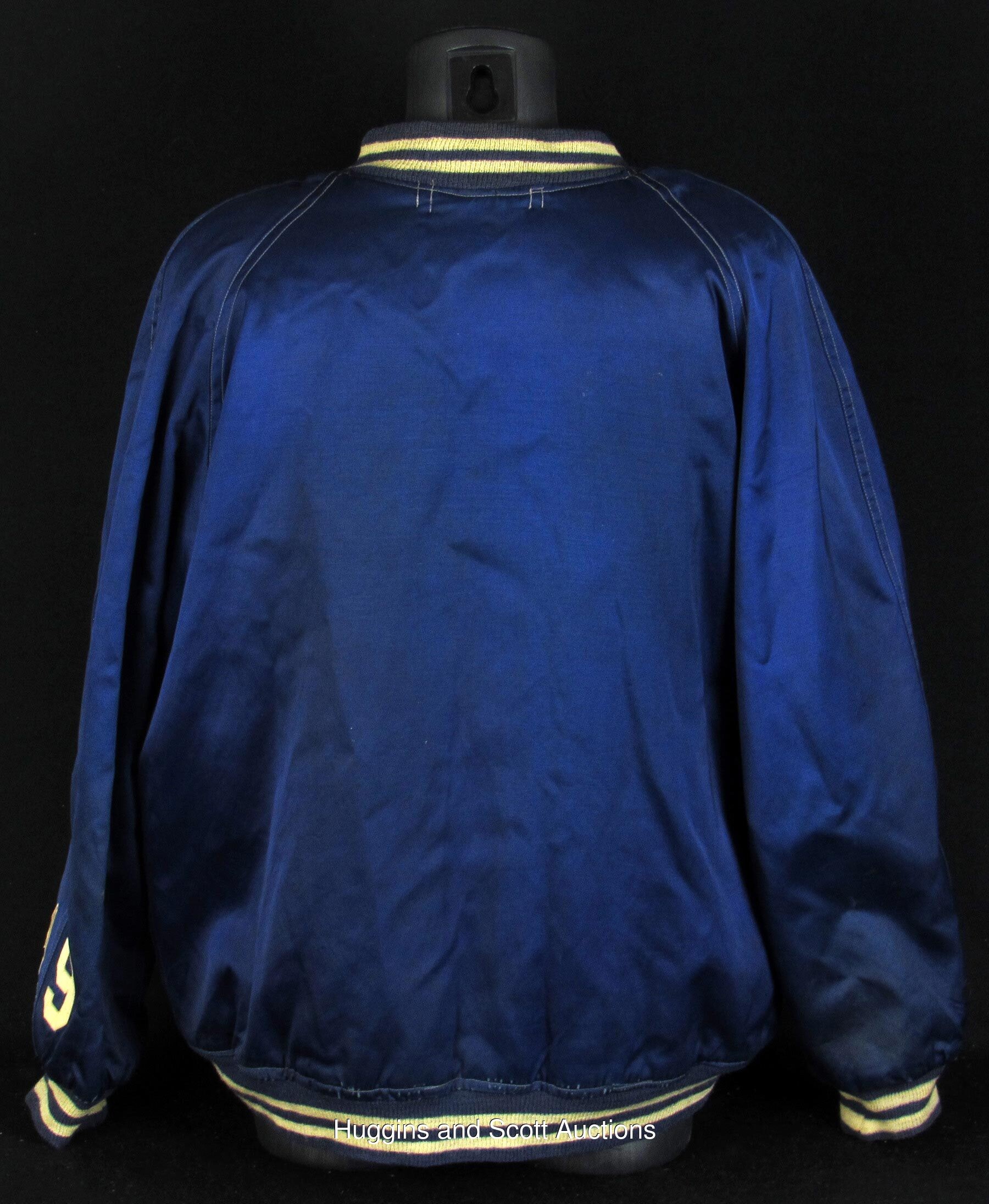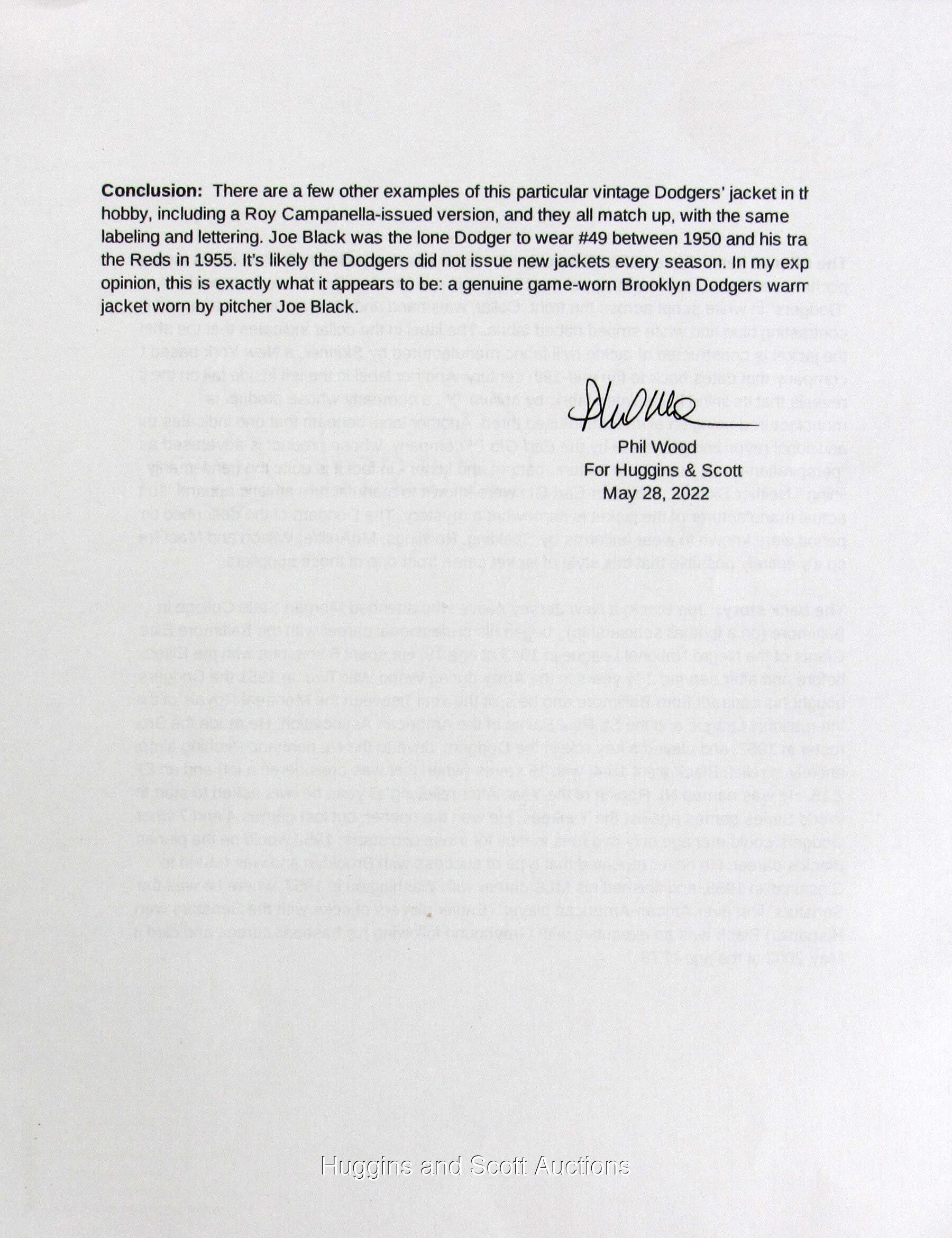 For starters, let"s note that an identical 1950s Brooklyn Dodgers warm-up jacket belonging to Roy Campanella sold at auction for over $70,000 in 2014. Offered here is teammate Joe Black"s jacket, which can be pinpointed to his 1952-55 tenure in Brooklyn. That span included Black"s NL Rookie of the Year campaign, when he posted a 15-4 record with 15 saves, a 2.15 ERA and a league-leading 41 games finished—not to mention a Game 1 win in the "52 World Series. The zipper-up, size-46 jacket distinctively features the prominent numerals of "49" on its left forearm. There are also two front pockets, blue-and-white-striped trim, "Dodgers" across the chest, and manufacturing labels for Skinner (tackle-twill shell), Milium (aluminum-infused insulated lining) and Earl-Glo (rayon lining). As authenticator Phil Wood explains, "Neither Skinner, Milium or Earl-Glo were known to manufacture athletic apparel, so the actual manufacturer of the jacket is somewhat a mystery. The Dodgers of the described time period were known to wear uniforms by Spalding, Rawlings, McAuliffe, Wilson and MacGregor, so it"s entirely possible that this style of jacket came from one of those suppliers." Wood"s analysis concludes, "There are a few other examples of this particular vintage Dodgers jacket in the hobby, including a Roy Campanella-issued version, and they all match up, with the same labeling and lettering. Joe Black was the lone Dodger to wear #49 between 1950 and his trade to the Reds in 1955. It"s likely the Dodgers did not issue new jackets every season. In my expert opinion, this is exactly what it appears to be: a genuine game-worn Brooklyn Dodgers warm-up jacket worn by pitcher Joe Black." EX condition overall. Accompanied by a Joe Black stadium pin.