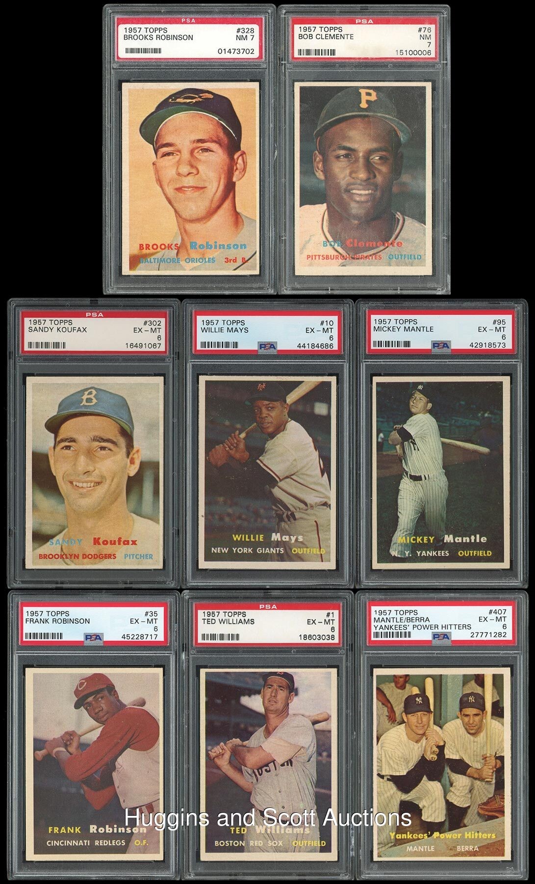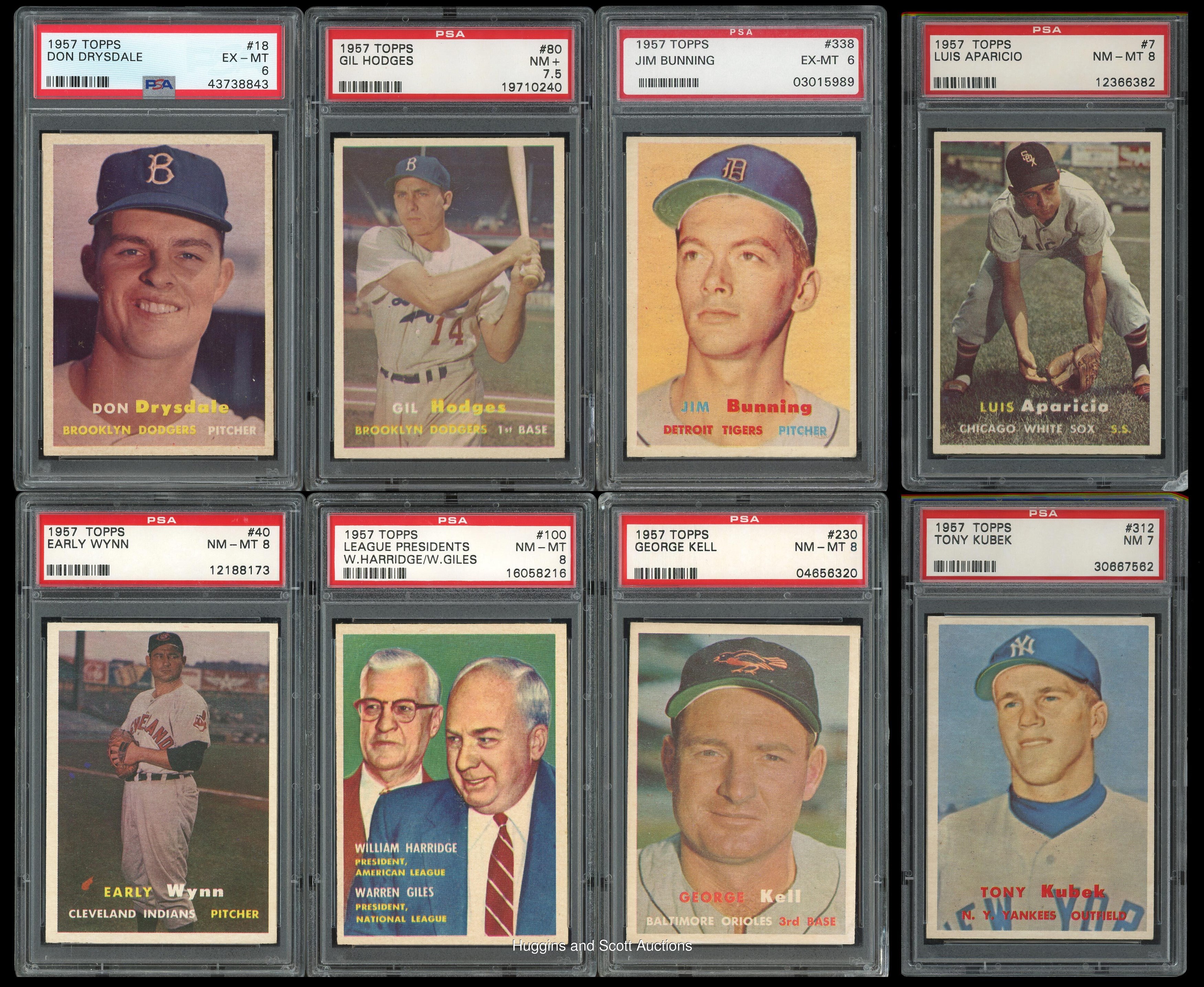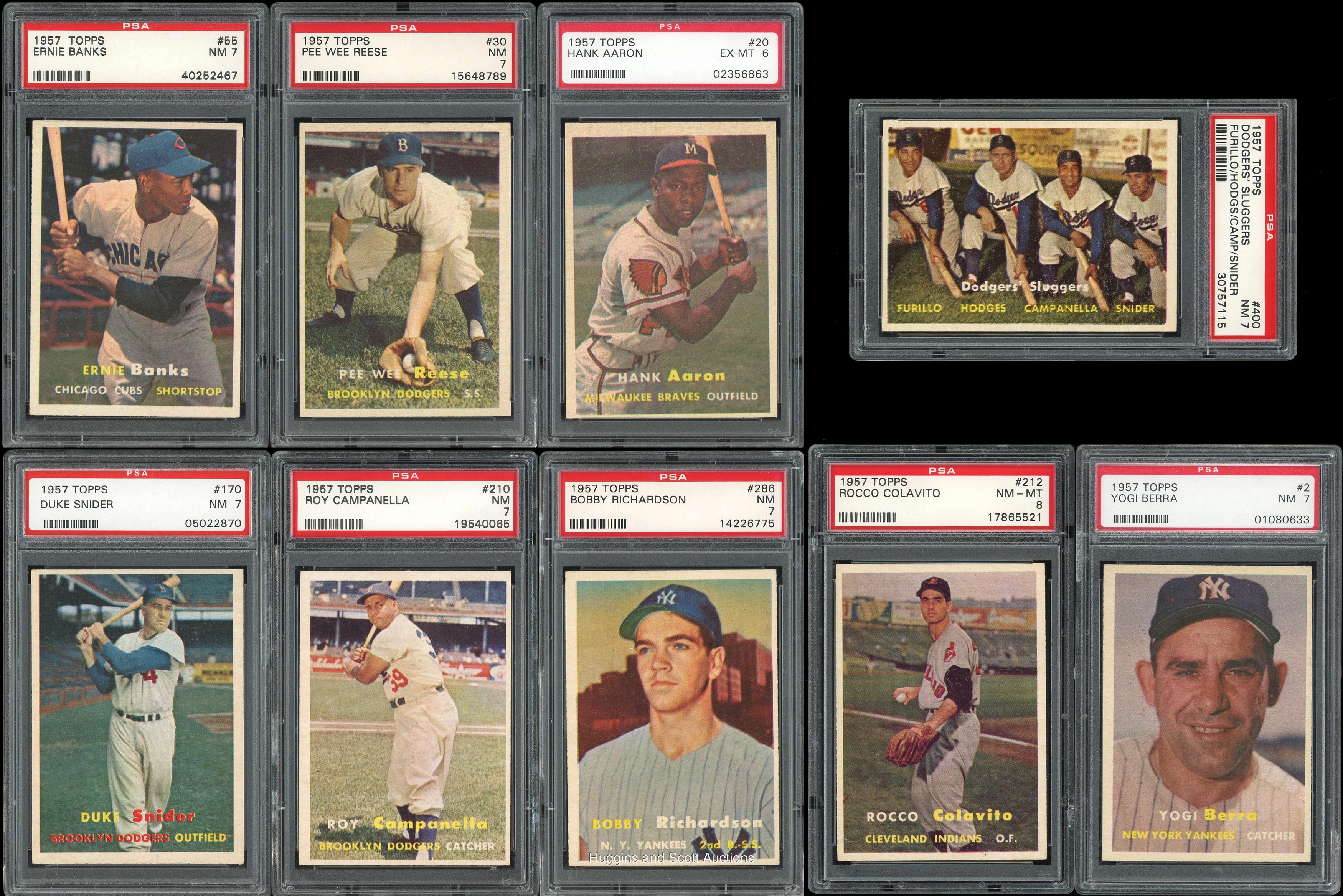 Extraordinary 1957 Topps Baseball complete PSA graded set of (407) cards with an average PSA GPA of 7.189! Significant time and care were employed by our consignor in piecing together this elite standard sized issue! Highlights include: PSA NM-MT 8: #7 Aparicio, #40 Wynn, #59 Di. Williams, #100 Harridge/Giles, #138 Minoso, #212 Colavito RC, #230 Kell; PSA NM+ 7.5: #80 Hodges; PSA NM 7: #2 Berra, #25 Ford, #30 Reese, #38 Ford, #55 Banks, #62 B. Martin, #70 Ashburn, #76 Clemente, #85 Doby, #90 Spahn, #97 Yankees Team, #120 Lemon, #125 Kaline, #154 Schoendienst, #165 Kluszewski, #170 Snider, #203 Wilhelm, #210 Campanella, #215 Slaughter, #250 Mathews, #286 Richardson RC, #312 Kubek RC, #317 Giants Team, #322 Reds Team, #324 Dodgers Team, #328 B. Robinson RC, #400 Dodgers’ Sluggers; PSA EX-MT 6: #1 T. Williams, #10 Mays, #15 Roberts, #18 Drysdale RC, #20 Aaron, #24 Mazeroski RC, #35 F. Robinson RC, #95 Mantle, #302 Koufax, #338 Bunning RC and #407 Mantle/Berra. A complete list follows: # PSA PLAYER 1 6 Williams 2 7 Berra 3 7.5 4 6 5 7 Maglie 6 7 7 8 Aparicio 8 6 9 7 10 6 Mays 11 7 12 7 Groat 13 8 14 7 15 6 Robin Roberts 16 8 17 7 18 6 Drysdale 19 7 20 6 Aaron 21 7 22 7 23 7 24 6 Maz 25 7 Ford 26 7 27 8 28 7 29 8 Herzog 30 7 Reese 31 7 32 8 33 7 34 8 35 6 F. Robinson 36 7 37 7 38 7 Nellie Fox 39 7 40 8 Wynn 41 7 42 7 43 7.5 44 7 45 7 Furillo 46 8 47 7 48 7 49 8 50 7 Score 51 8 52 8 53 8 Labine 54 8 55 7 Banks 56 7 57 7 58 7 59 8 60 7 61 8 62 7 Billy Martin 63 7 64 7 65 8 66 7 67 7 68 7 69 7 70 7 Ashburn 71 7 72 8 73 7 74 7 75 7 76 7 Clemente 77 7 78 8 79 7 Hodges 80 7.5 81 7 82 7 Elston Howard 83 8 84 8 85 7 Doby 86 7 87 8 88 7 Kuenn 89 7 90 7 Spahn 91 7 92 7 93 7 94 7 95 6 Mantle 96 8 97 7 Yankees Team 98 7 Al Dark 99 7 100 8 League Pres 101 7 102 8 Ray Boone 103 7 104 7 105 7 106 7 107 8 108 7 109 7 110 8 111 7 112 8 113 8 114 7 115 6 Jim Gilliam 116 7 117 7 118 7 119 7 120 7 Bob Lemon 121 7 Clete Boyer 122 7 Ken Boyer 123 7 124 7 125 7 Kaline 126 7 127 7 128 7 129 8 130 7 Newcombe 131 8 132 7 133 7 134 7 135 7 Skowron 136 8 137 7 138 8 139 7 140 8 141 7.5 142 8 143 7 144 8 145 7 146 7 147 7 148 8 149 8 150 7 151 8 152 7 153 7 154 7 Schoendienst 155 7 156 7 157 7 158 8 159 7 160 7 161 6 162 7 Ted Kluszeweki 163 7 164 7 165 7 166 8 167 8 168 7 169 7 170 7 Snider 171 7 172 7 173 7 174 7 175 7 Don Larsen 176 7 177 7 178 7 179 7 180 7 181 7 182 7 183 7 184 7 185 8 186 7 187 8 188 7 189 7 190 7 191 7 192 7 193 7 194 7 195 7 196 7.5 197 8 198 7 199 8 200 7 Gil McDougald 201 7 202 7 203 7 204 7 205 7 206 8 207 7 208 8 209 8 210 7 Campy 211 8 212 8 Colavito 213 7 214 7 215 7 Slaughter 216 7 217 7 218 7 219 7 220 7 Jackie Jensen 221 8 222 8 223 8 224 7 225 7 226 7 227 7 228 7 229 7 230 8 Kell 231 8 232 8 233 8 234 8 235 7 236 7 237 7.5 238 7 239 8 240 7 Bauer 241 7 242 7 243 7 244 8 245 8 246 7 247 7 248 7 249 7 250 7 Matthews 251 8 252 8 Erskine 253 7 254 8 255 7 256 8 257 7 258 8 259 8 260 8 261 7 262 7 Bobby Thomson 263 8 264 7 265 7 Haddix 266 7 267 7 268 7 Richardson 269 7 Cerv 270 7 Senators Team 271 7 272 7 Shantz 273 7 274 7 275 8 Indians Team 276 6 277 7 Podres 278 7 279 7 280 7 281 7 282 7 283 7 284 7 Zimmer 285 7 286 7 B. Richardson 287 7 288 7 289 8 290 7 291 7 292 7 293 7 294 7 295 7 296 7 297 7 298 7 299 7 300 7 Mike Garcia 301 7 302 6 Koufax 303 7 304 7 305 7 306 7 307 7 308 7 309 7 310 7 311 8 312 7 Kubek 313 7 314 7 315 7 316 7 317 7 Giants Team 318 7 319 7 320 7 321 7 322 7 Reds Team 323 7 324 7 Dodgers Team 325 7 326 7 327 7 328 7 B. Robinson 329 7 White Sox Team 330 8 331 7 332 7 333 7 334 7 335 6 336 7 337 7 338 6 Bunning 339 7 340 7 341 7 342 6 343 7 344 7 345 7 346 7 347 7 348 7 349 7 350 7 351 7 352 7 353 7 354 7 355 7 356 8 357 7 358 7 359 7 360 7.5 361 7 362 8 363 8 364 7 365 7 366 7 367 7 368 7.5 369 7 370 7 371 7 372 8 373 7 374 8 375 7 376 7 377 8 378 8 379 7 380 7 381 7 382 7 383 7 384 7 385 8 386 7 387 7 388 8 389 8 390 7 391 7 392 8 393 7 394 8 395 8 396 8 397 8 398 7 399 7 400 7 Dodgers Sluggers 401 7 402 8 403 7 404 8 405 7 406 7 407 6 Mantle/Berra PH 6 18 108 7 290 2030 7.5 8 60 8 91 728 TOTAL 407 2926 7.189 average