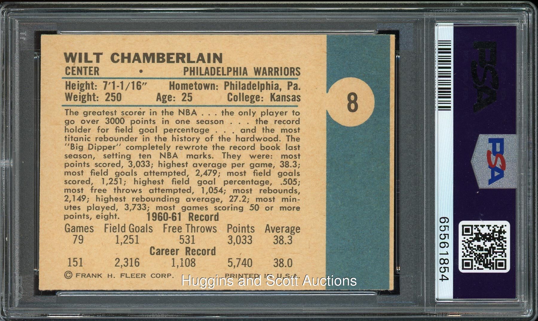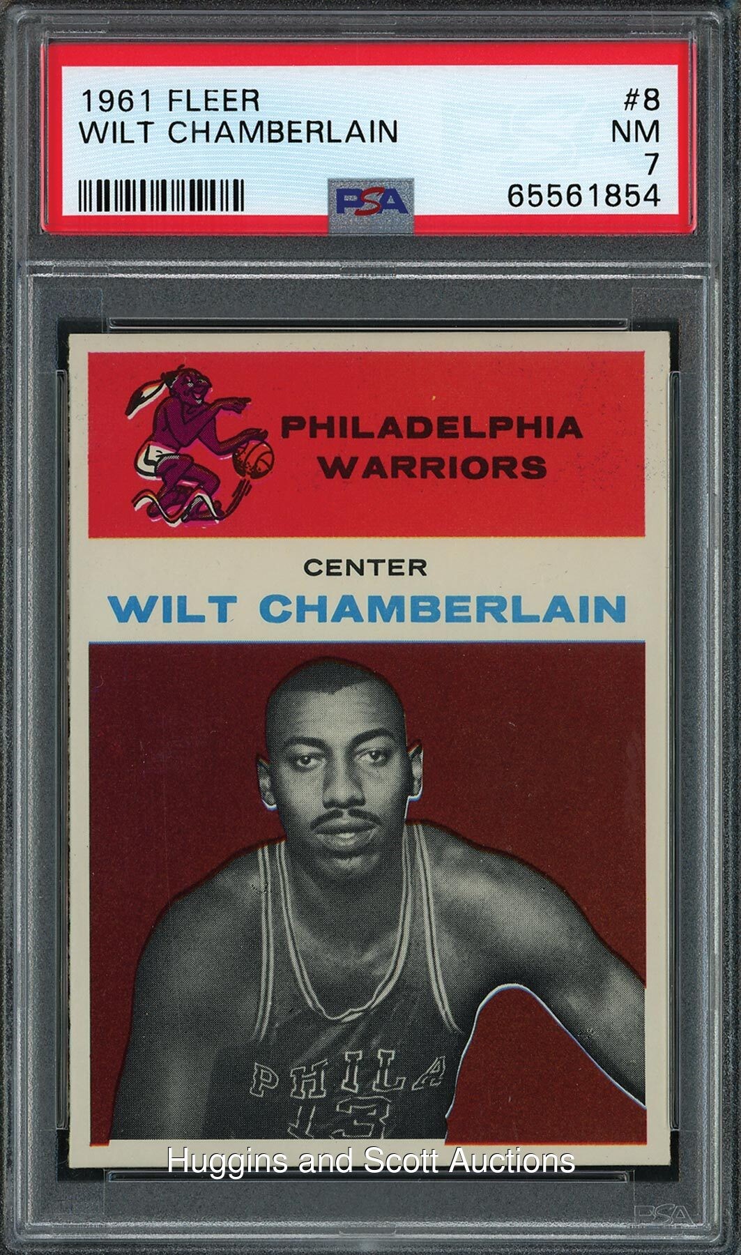 Graded NM 7 by PSA. Can you measure up to the offered 1961-62 Fleer Basketball rookie card of #8 Wilt (The Stilt) Chamberlain? This legendary basketball card comes from the season in which Chamberlain hit the points century mark in a game against the New York Knicks. This blazer is accurately centered with four razor-sharp corners, creamy factory edges and vibrant surface colors. The reverse which touts the Kansas product"s prolific stat line is wax stain-free. Ranks in the upper 25% of all similar examples evaluated by the authenticator.