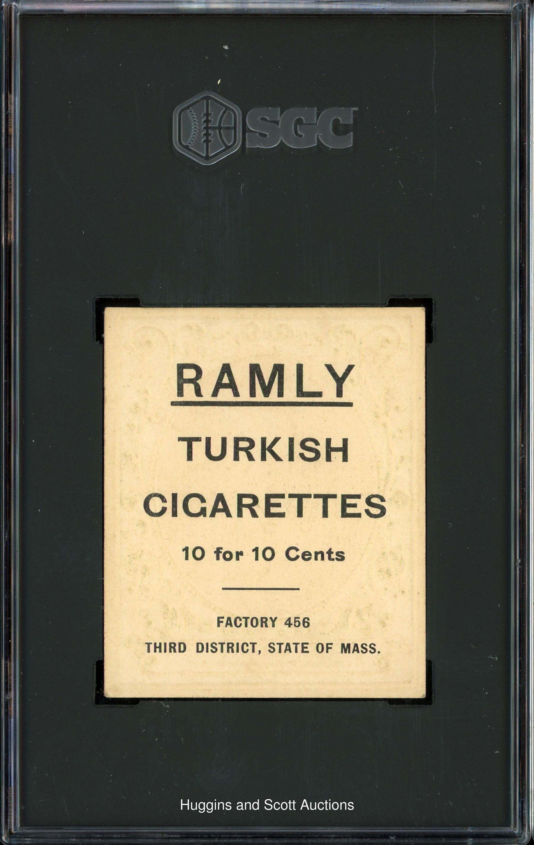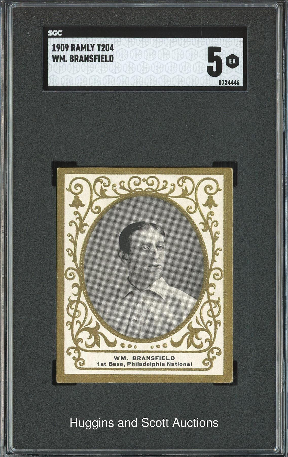 Graded 5 EX by SGC. Catch the offered 1909 T204 Ramly William (Kitty) Bransfield relic. This oval black-and-white portrait of the veteran is flanked by embossed bordering and an ornate floral design. The golden border displays only slight touches and the advertising back is problem-free. One of only 19 total of the player graded by the authenticator.