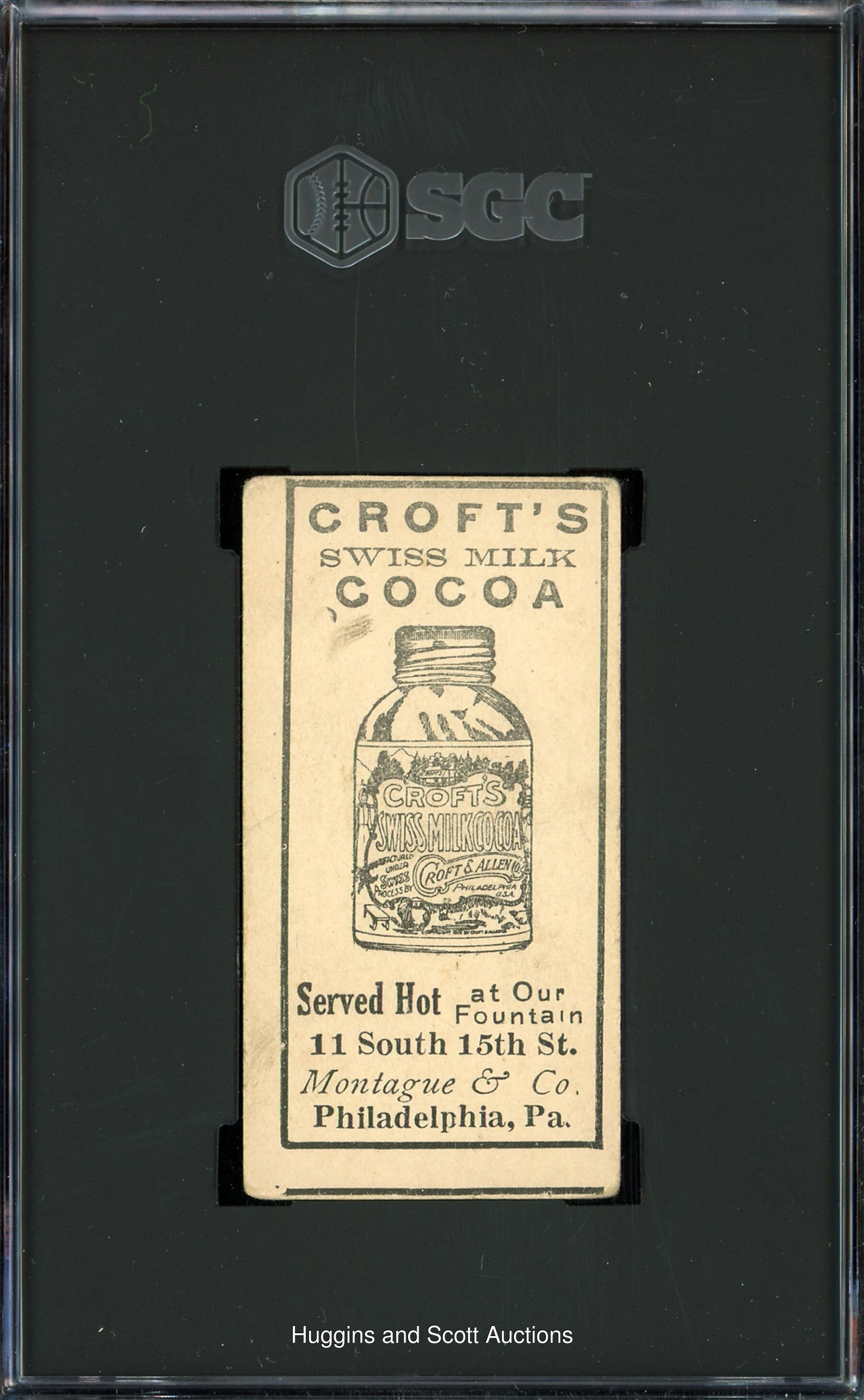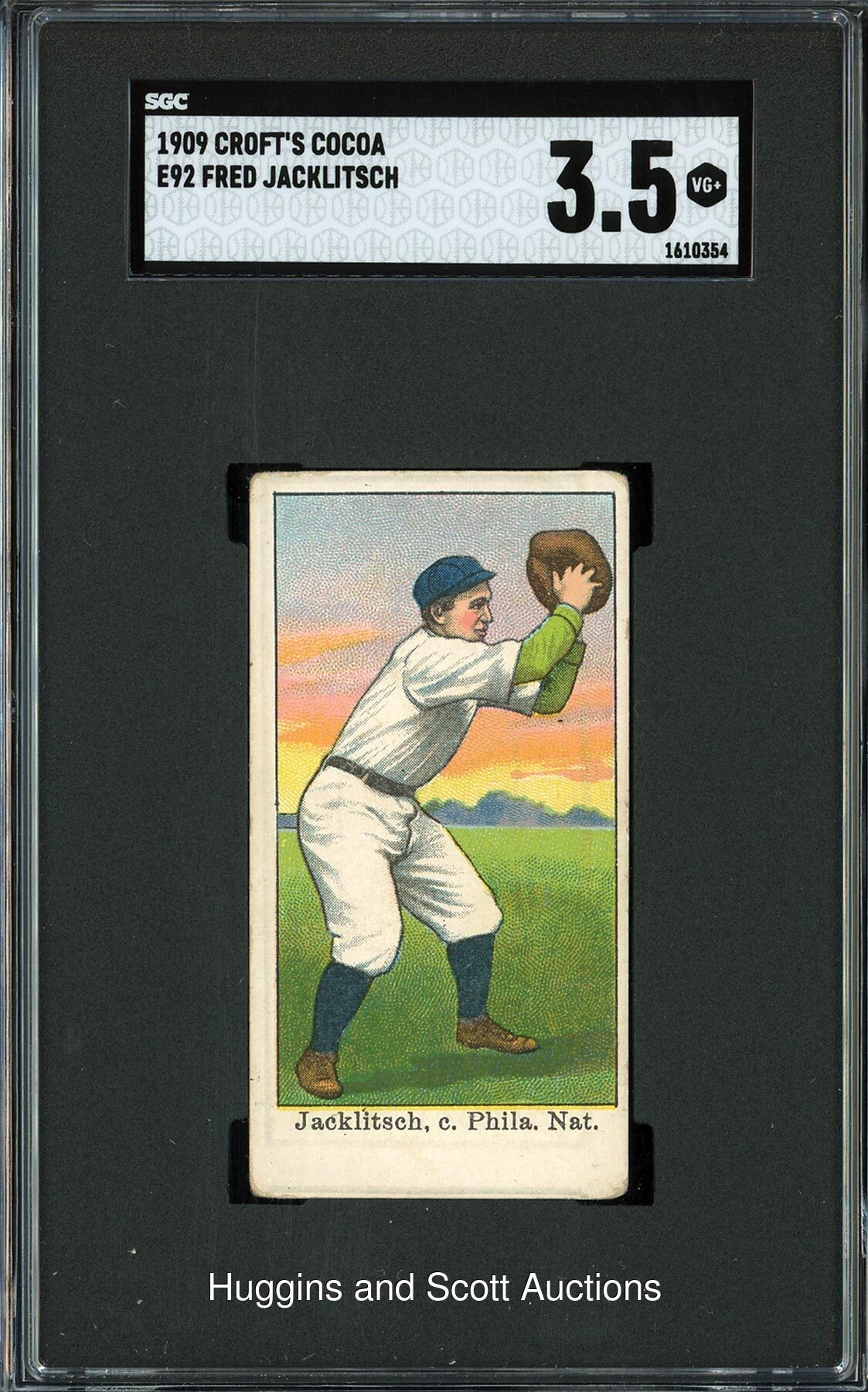 Graded 3.5 VG+ by SGC. Sterling 1909 E92 Croft"s Cocoa Fred Jacklitsch portraying the catcher fielding his position against a tri-color backdrop. This Philadelphia-based Type is crease-free with bold surface colors and an off-centered advertising back. Of the six total graded by SGC, this example survives as the lone copy at the grading level with none better!