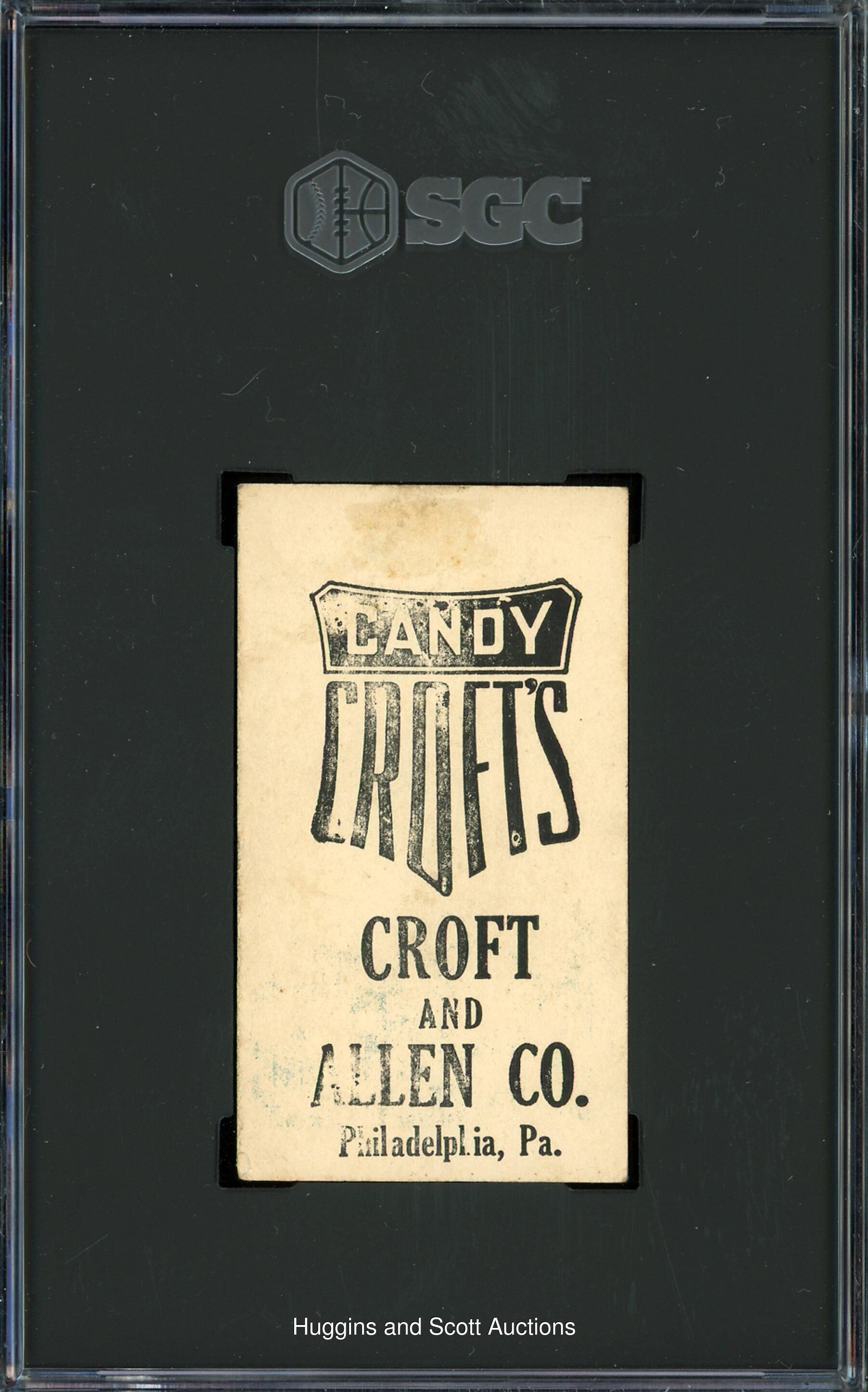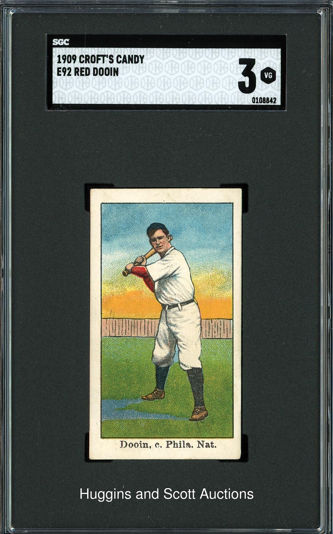 Graded 3 VG by SGC. Breathtaking 1909 E92 Croft"s Candy Red Dooin. While the front is crease-free with four evenly touched corners and blistering surface colors, the black text advertising reverse displays only moderate paper pulling and trace residue. Of the six total validated by SGC, this artifact ranks as 1 of 2 at the grading level with only one better.