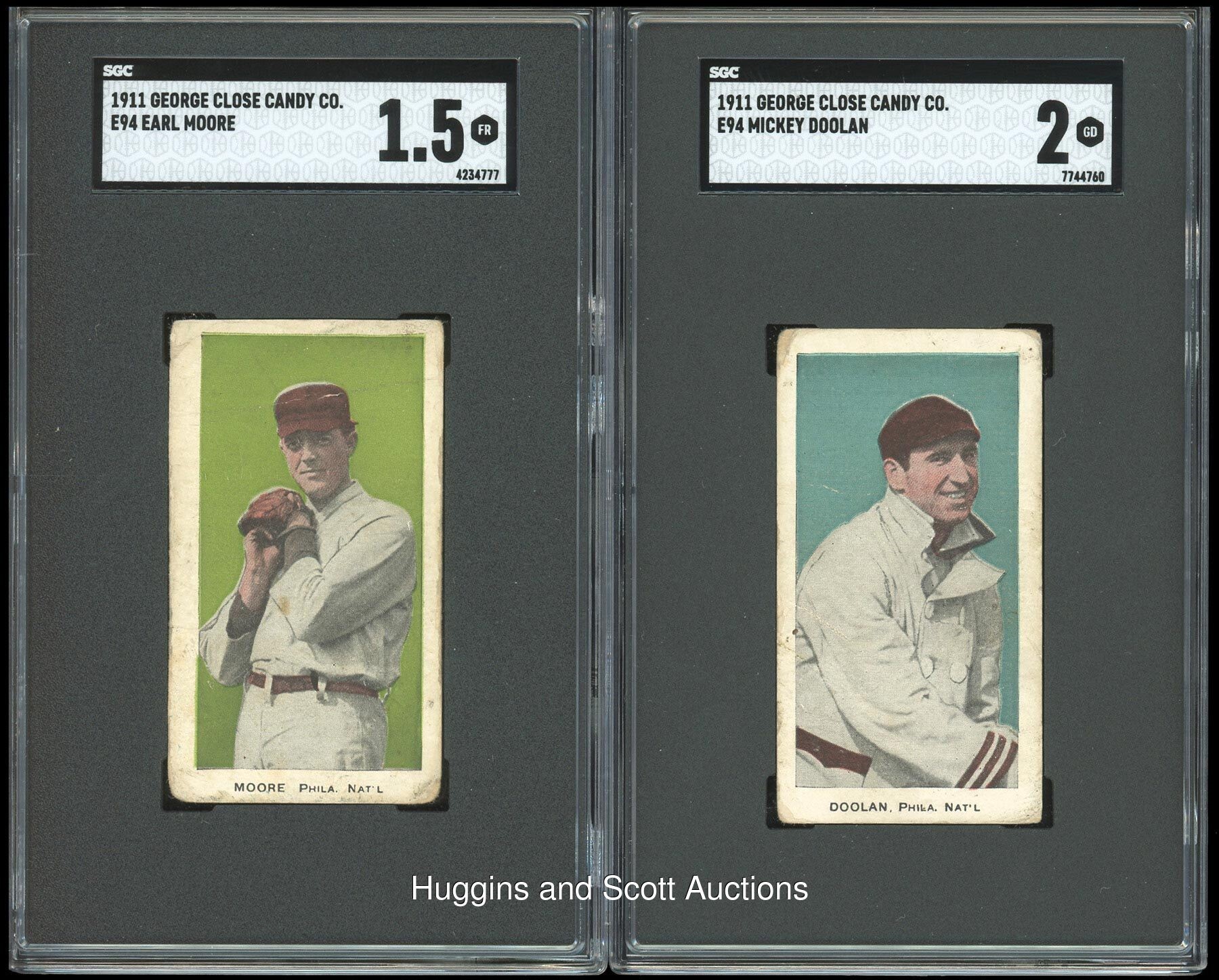 Tough pair of 1911 E94 George Close Candy Philadelphia Phillies singles. Each graded by SGC. Includes: 1.) Doolan (SGC 2 Good) with blue background and 2.) Moore (SGC 1.5 Fair) with olive background.