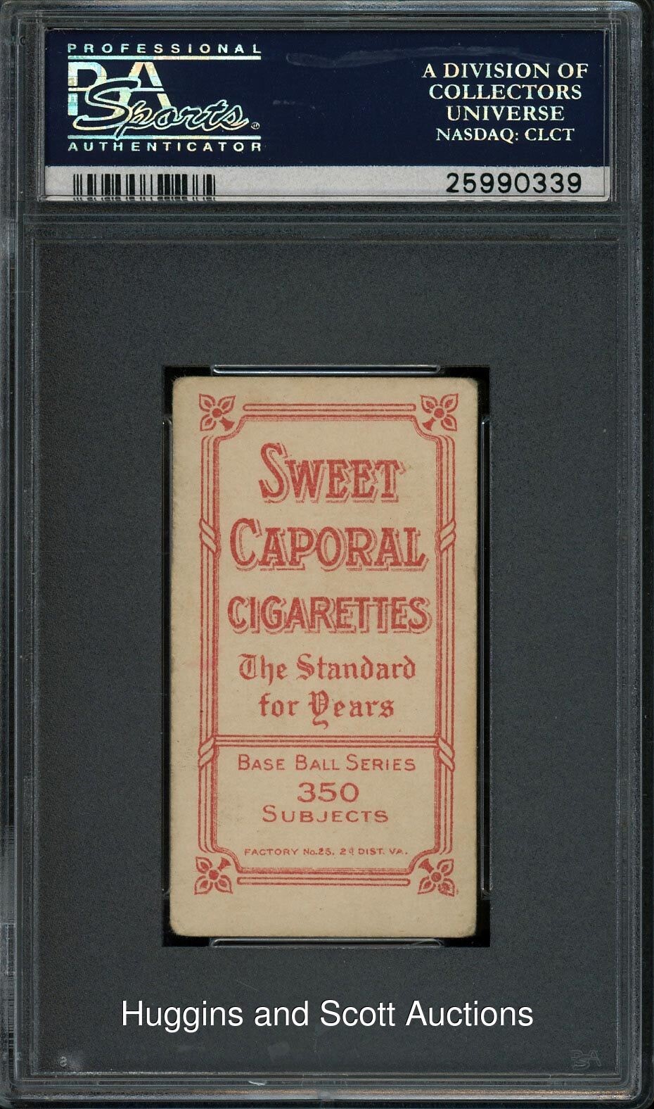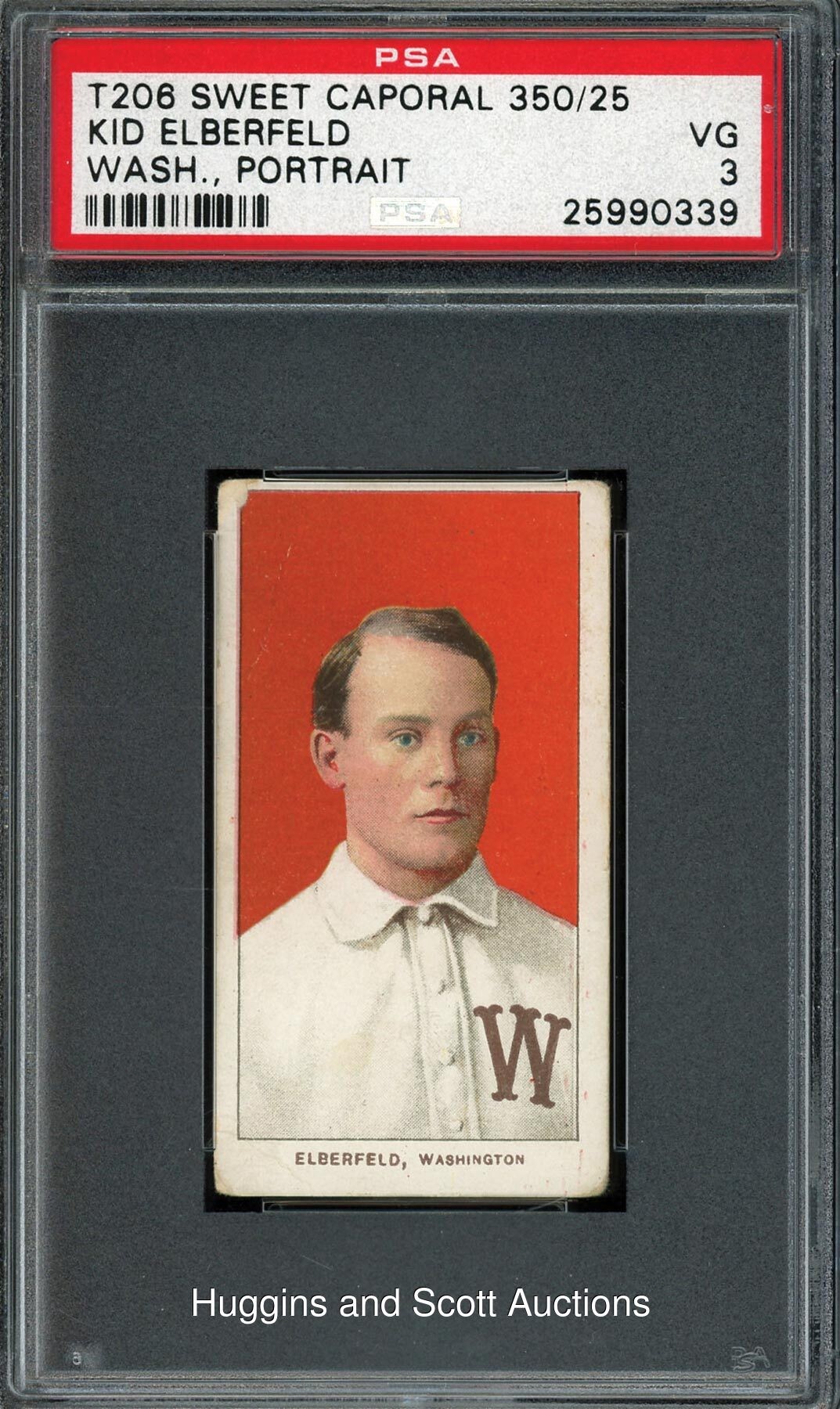 Graded VG 3 by PSA. Norman (Kid) Elberfeld of the Senators emerges on this scarce (Washington, Portrait) card. While not one of the "Big Four" rarities in the 1909-11 T206 White Borders series, the offered example certainly belongs in the next tier of desirable scarcities. This team name variation is flanked by a Sweet Caporal 350 (Factory 25) back. Despite moderate corner rounding and a lower crease near the bottom left, "Kid"s" illustration is not seriously impacted.