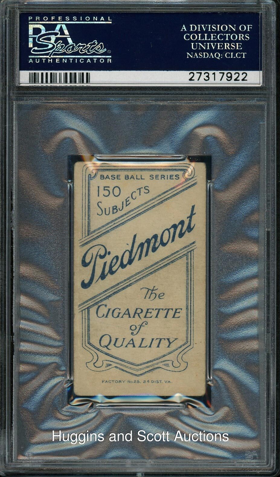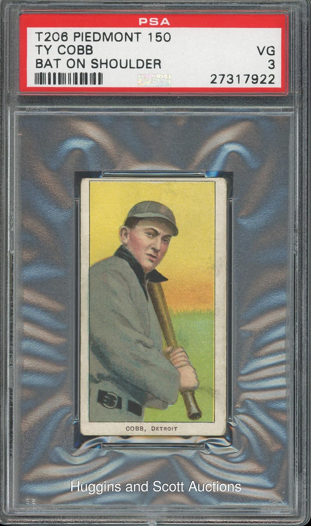 Graded VG 3 by PSA. Tyrus Raymond (Ty) Cobb clutches his weapon of choice on the offered (Bat On Shoulder) pose. This keynote rendition is exceptionally bright with a crease-free surface and only limited peripheral soiling. A particularly attractive example with a Piedmont 150 back.