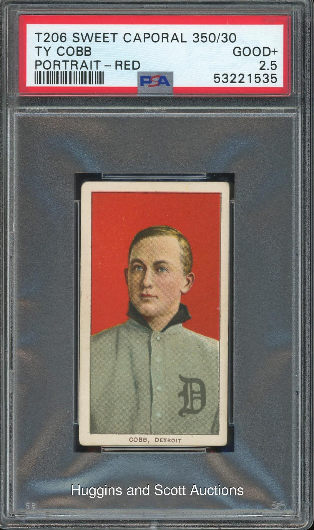 Graded Good+ 2.5 by PSA. Breathtaking 1909-11 T206 White Borders Ty Cobb (Red Portrait) pose. This instantly recognizable classic has exploded in value over the past couple of years and is poised to continue to skyrocket in value. Most importantly, this well centered "Georgia Peach" may very well be undergraded as the perfectly registered foundation is crease-free with minimally worn corners and clean edges. Sweet Caporal 350 (Factory 30) back.