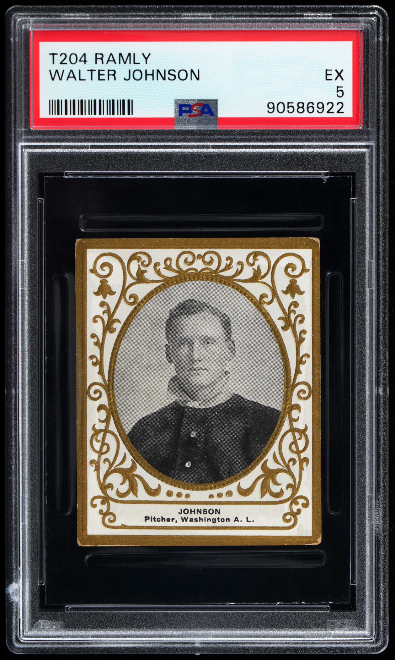 Graded EX 5 by PSA. Exceptional 1909 T204 Ramly Walter Johnson picturing the Washington Senators Hall of Famer just two years after being signed from Idaho State League. This oval black-and-white portrait of the Class of 1936 Hall of Famer is flanked by embossed bordering and an ornate floral design. As the undisputed key of the popular Boston-based designation, this early "Big Train" is considered by many hobbyists as Johnson's true rookie card. As of writing, only 37 total copies of this legend have been judged by PSA with 1 of 5 surviving at the grading level and only 9 better. A truly mesmerizing piece which showcases mostly accurate centering and only touches of wear on each corner, the brunt of which is found on the lower right point. The edges are otherwise unchipped and the vintage portrayal of the fireballer is crystal clear. Additionally, the Ramly advertising back is stain-free and amplified by bold advertising text. For those seeking a world class Walter Johnson from his playing days, look no further than this century-old headliner! Opening Bid $15,000.