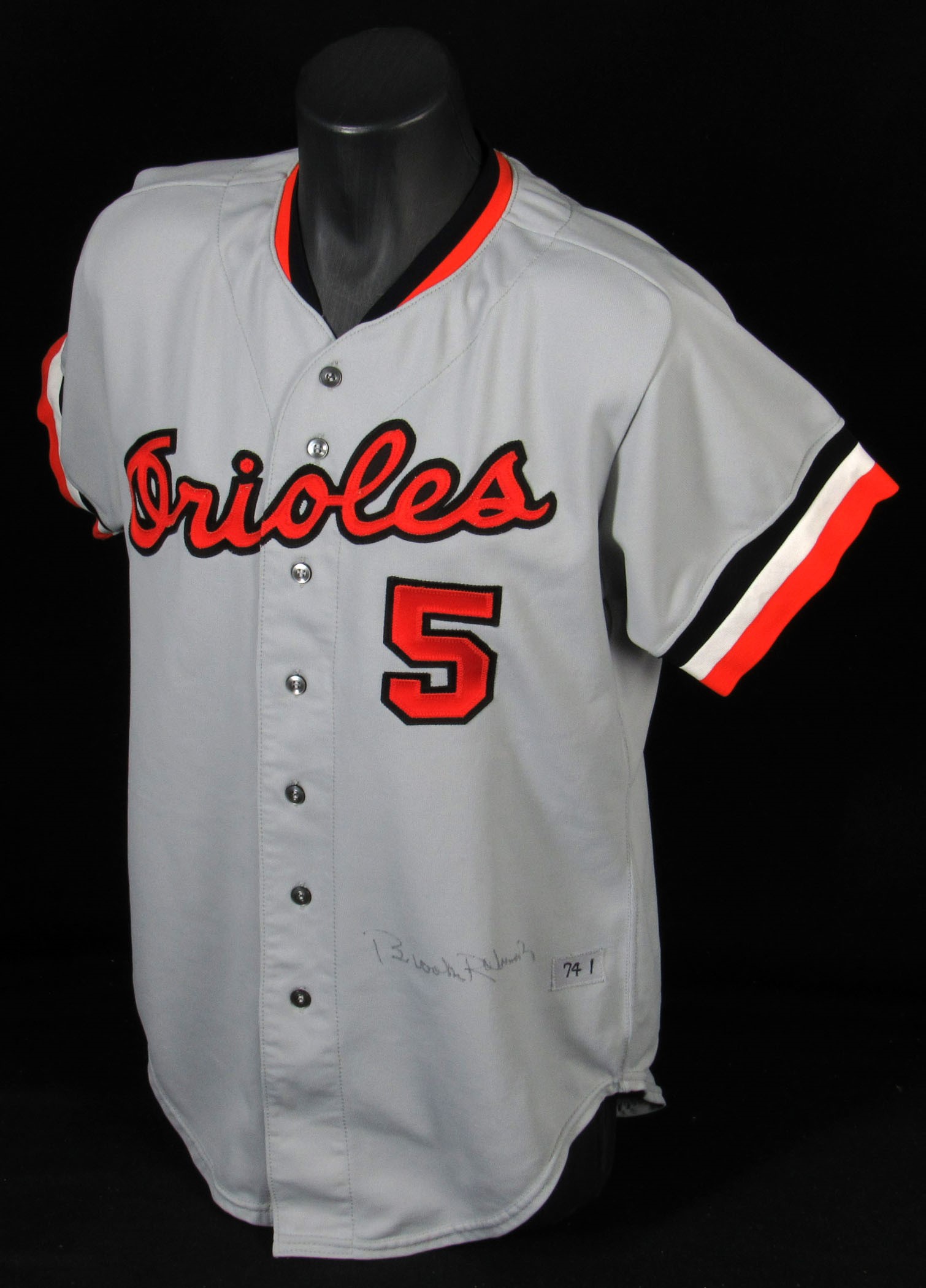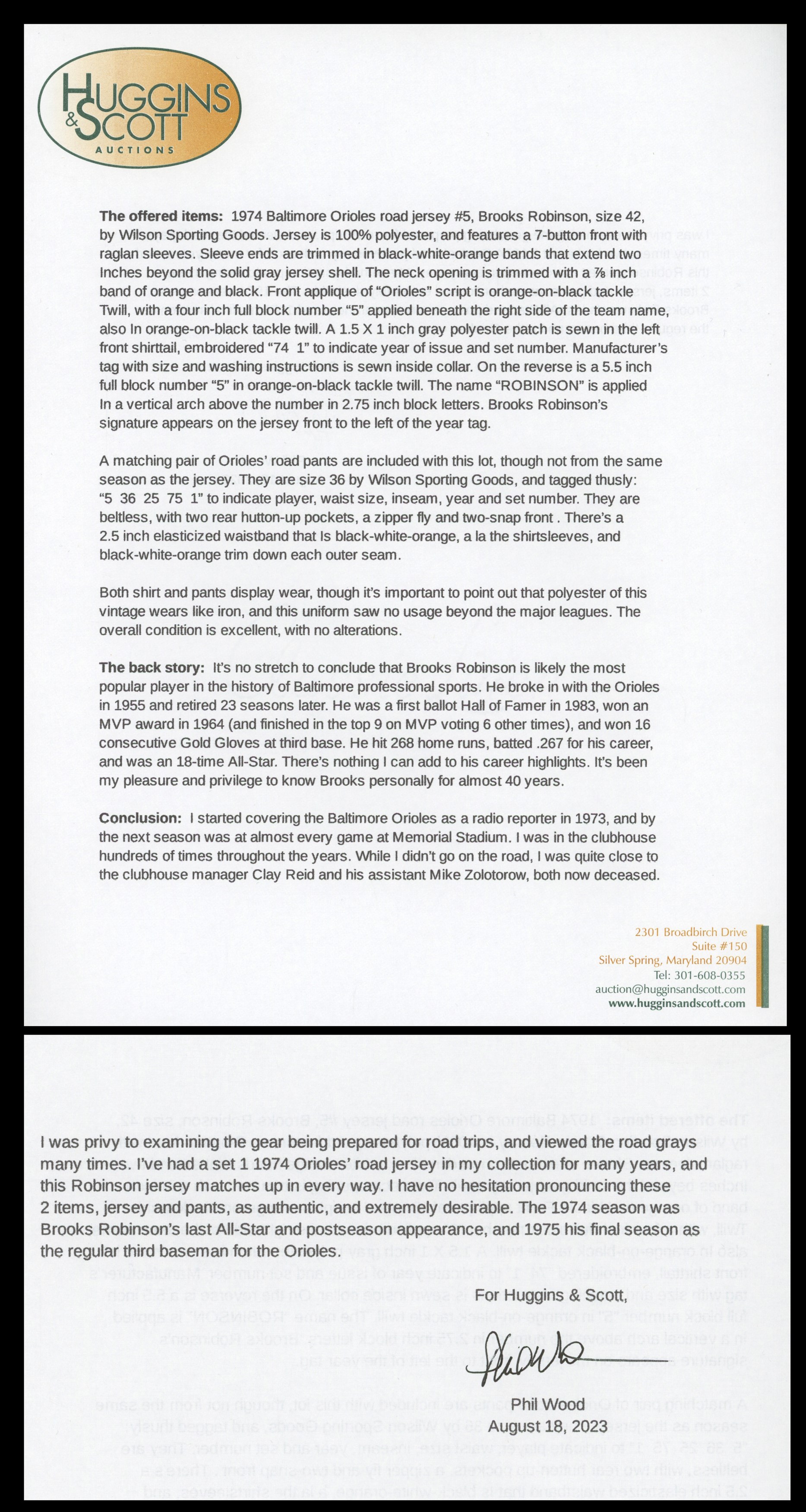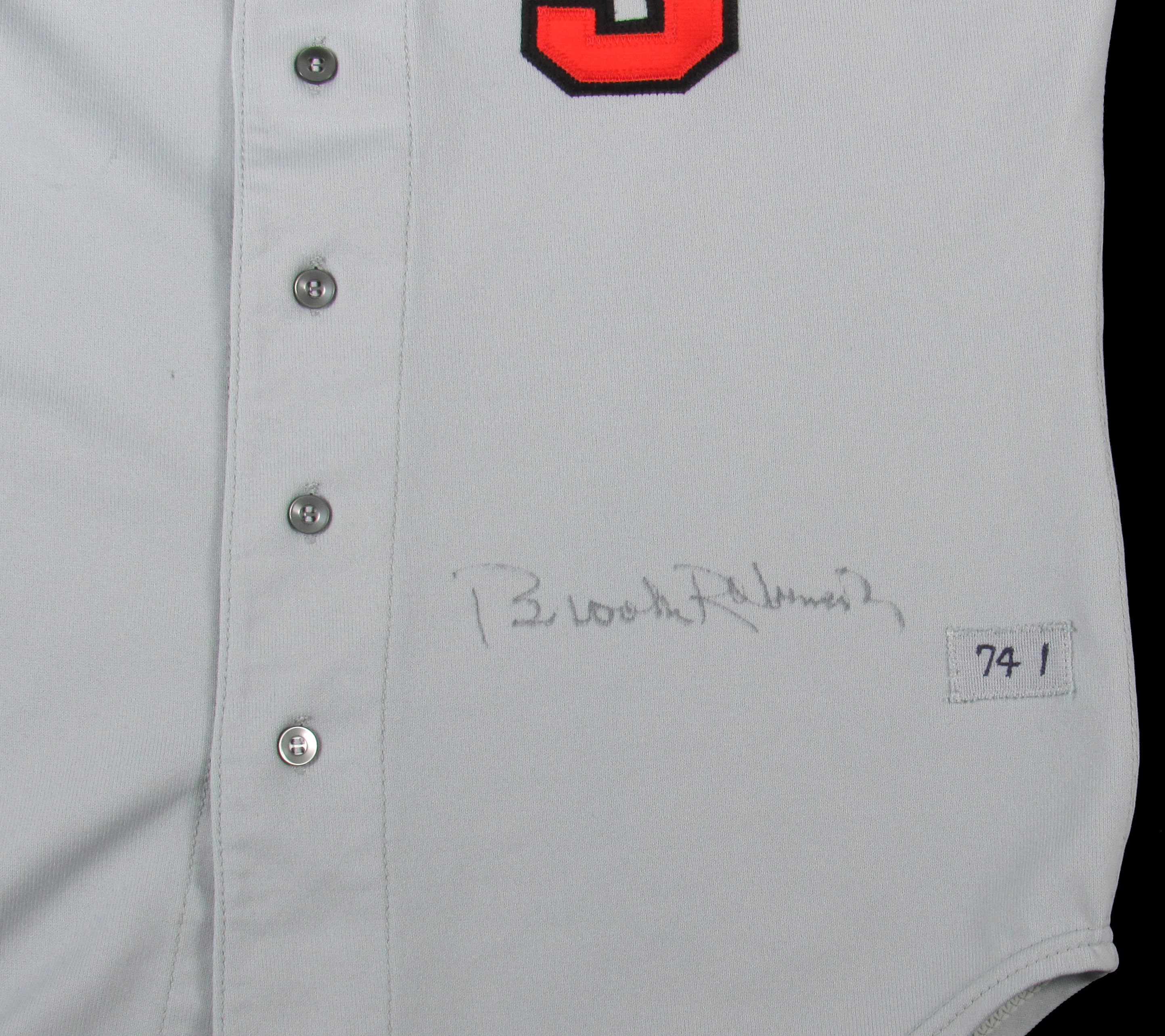 He didn't mash like Mike Schmidt, and he didn't hit like George Brett, but if you were making a mold for the ideal third baseman, 16X Gold Glove winner Brooks Robinson would have to be your model. Bring the "Human Vacuum Cleaner" into your collection, by acquiring this game-worn Baltimore Orioles road gray uniform. The jersey component of this shirt-pants combo, was worn by Robinson during the 1974 season, when he made it to the postseason for the final time in his glorious career, by helping the O's finish first in the AL East Division. Robinson's number "5" is seen on both the front, below the Orioles lettering, and on the back, below his name letter patches. Located inside the collar, is a Wilson factory label indicating the size "42", a tag on the right front tail reads "74 1", for year and uniform set number. Robinson has signed to the right of this year tag in black, and his autograph shows 6-7 strength. Dating from the 1975 season, the pants are labeled inside the waistband with a size "36" Wilson factory label, and an identification tag that reads " 5 36 25 75 1", indicating player number, waist size, inseam, year, and uniform set number. Both garments report in excellent condition, with only light signs of use/wear, most notably on the back patches. LOA from Phil Wood for the jersey and pants; auction LOA from James Spence/JSA for the autograph.. Opening Bid $1,500.