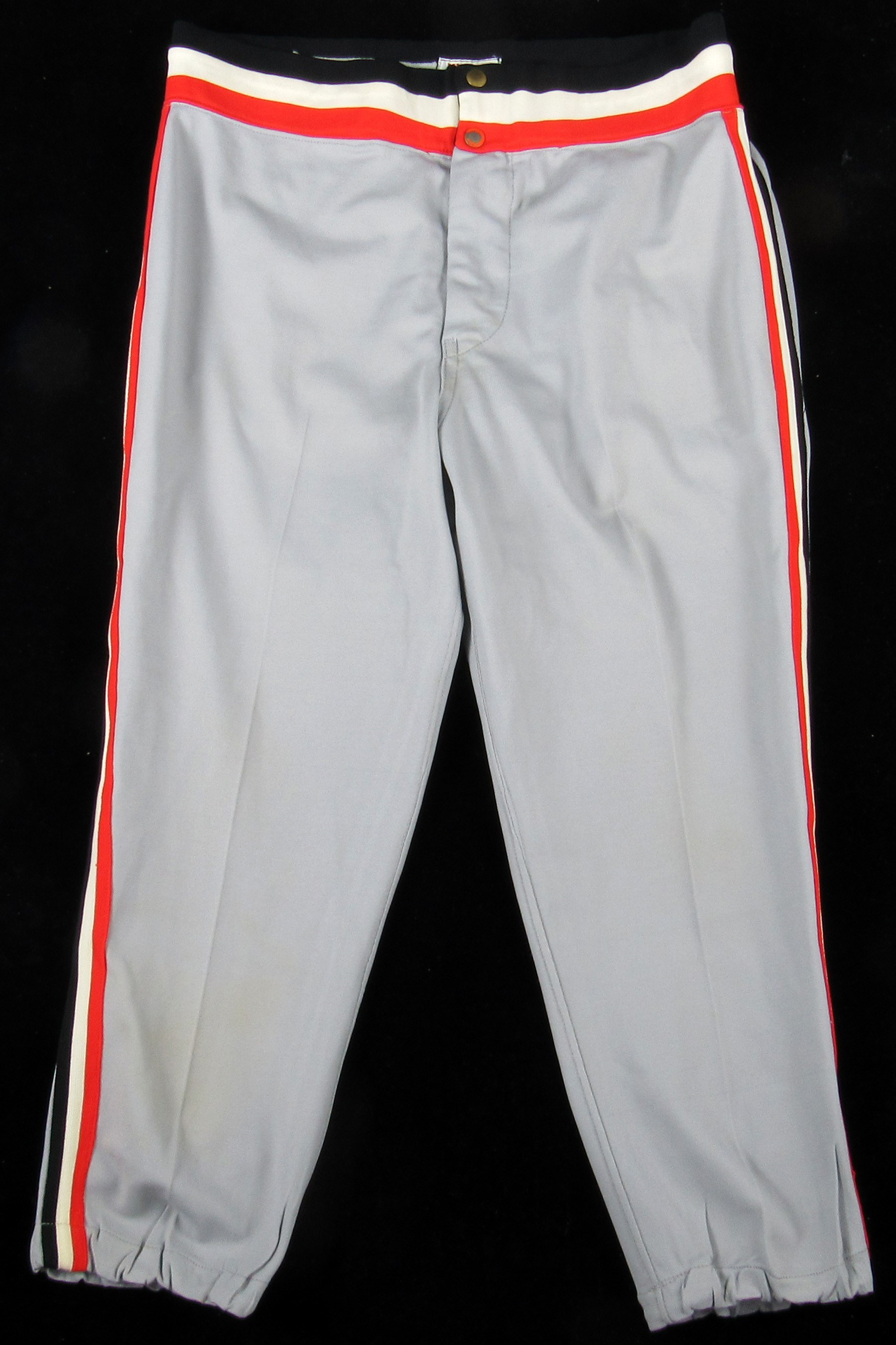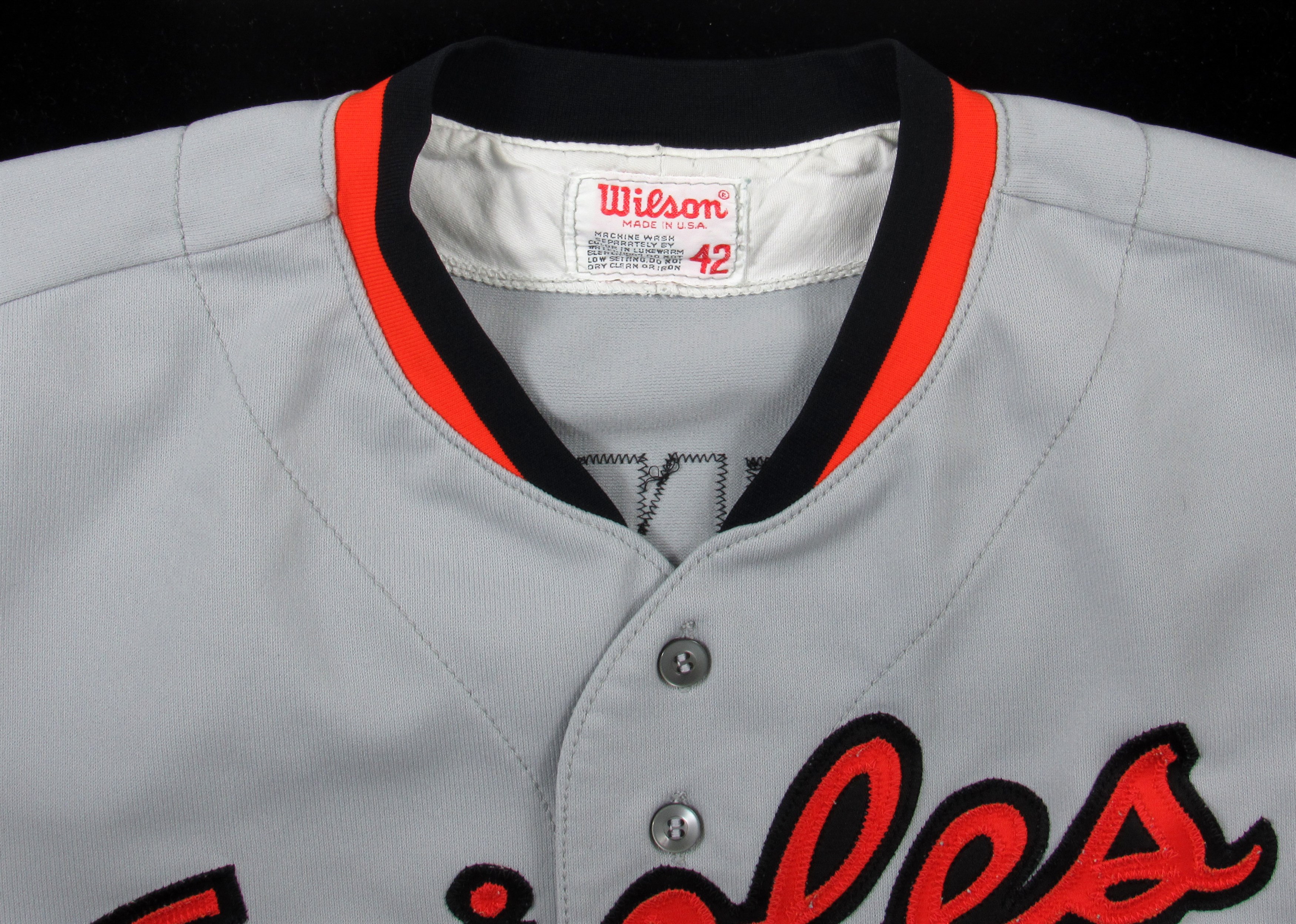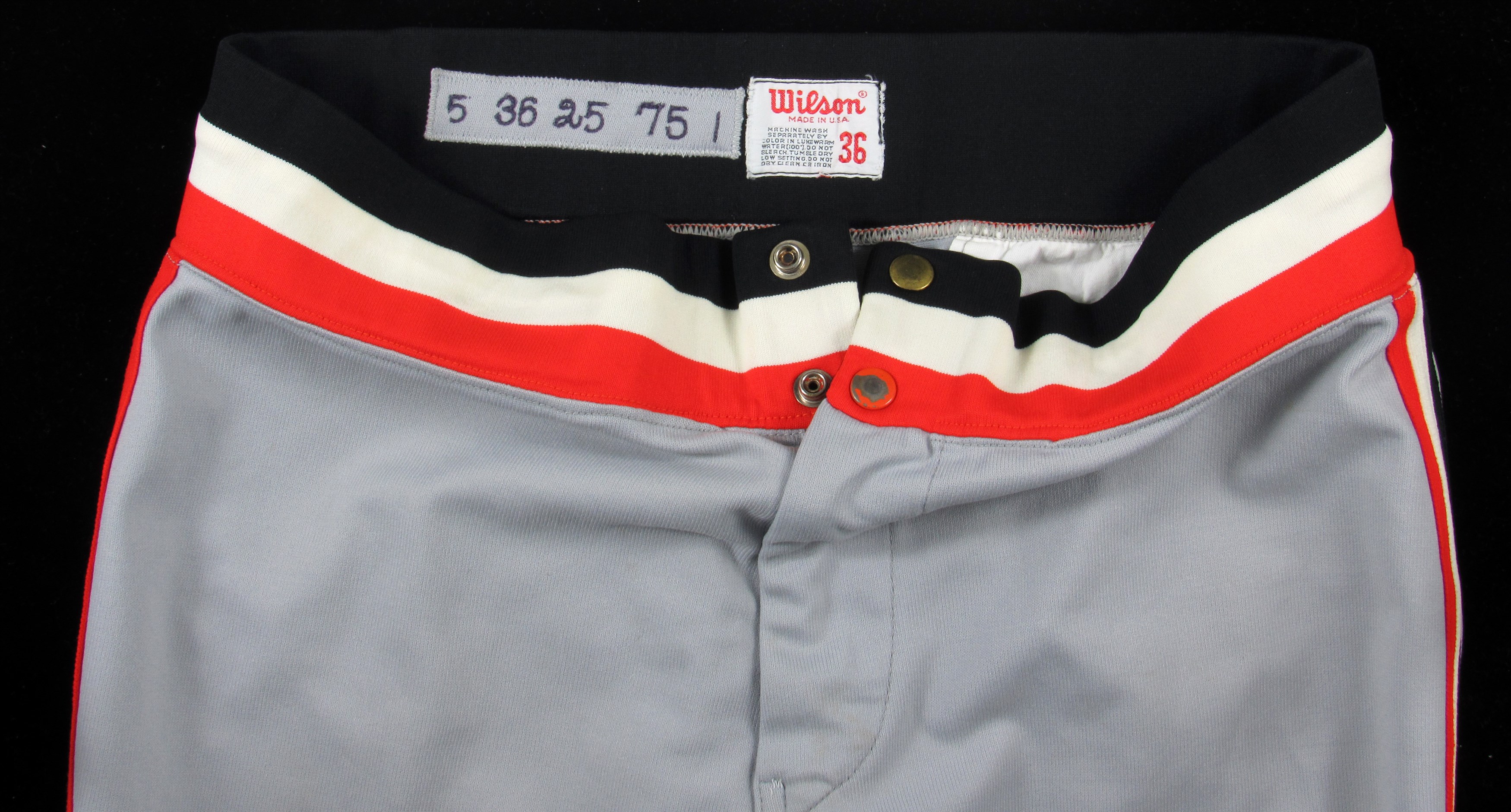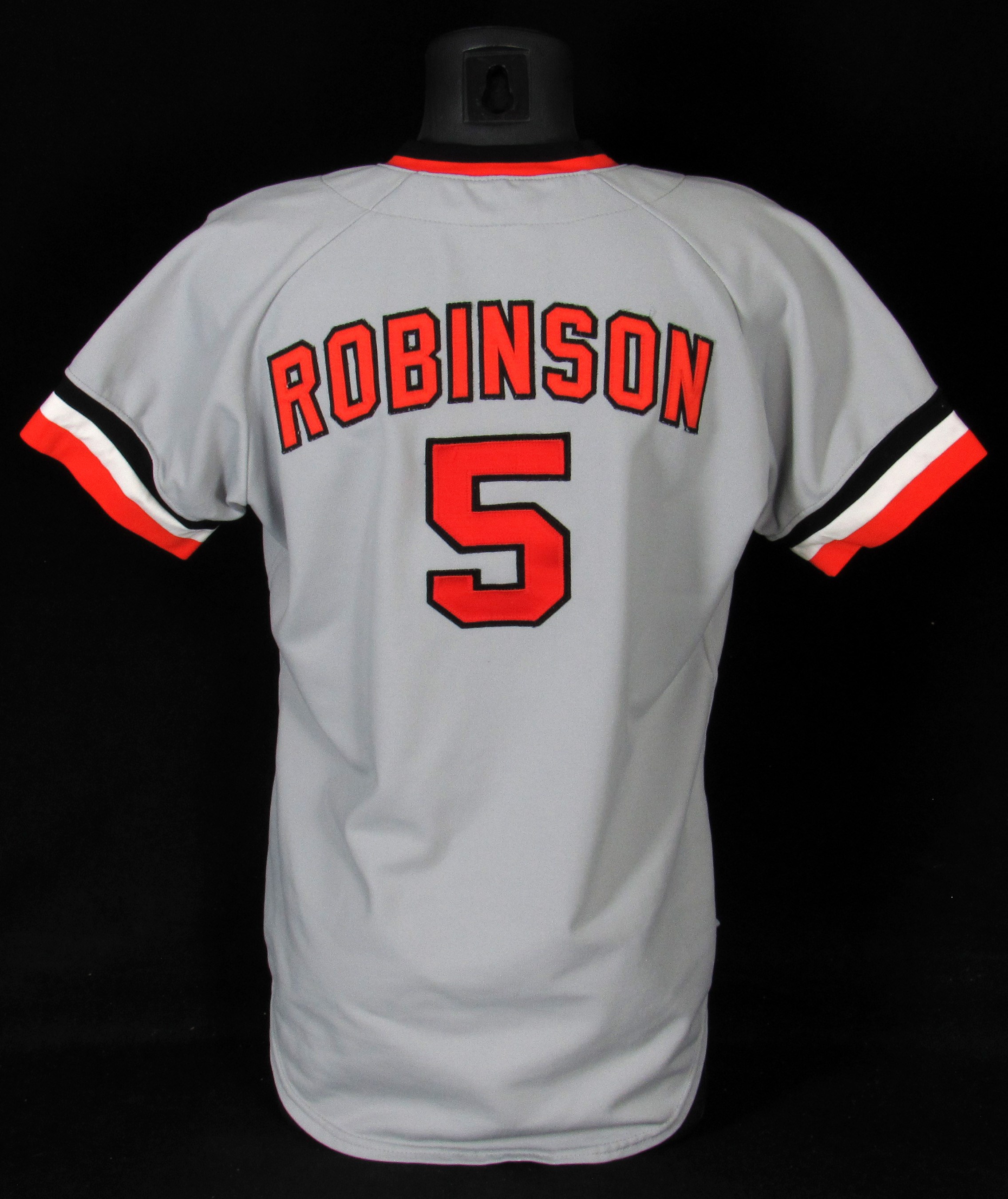 He didn't mash like Mike Schmidt, and he didn't hit like George Brett, but if you were making a mold for the ideal third baseman, 16X Gold Glove winner Brooks Robinson would have to be your model. Bring the "Human Vacuum Cleaner" into your collection, by acquiring this game-worn Baltimore Orioles road gray uniform. The jersey component of this shirt-pants combo, was worn by Robinson during the 1974 season, when he made it to the postseason for the final time in his glorious career, by helping the O's finish first in the AL East Division. Robinson's number "5" is seen on both the front, below the Orioles lettering, and on the back, below his name letter patches. Located inside the collar, is a Wilson factory label indicating the size "42", a tag on the right front tail reads "74 1", for year and uniform set number. Robinson has signed to the right of this year tag in black, and his autograph shows 6-7 strength. Dating from the 1975 season, the pants are labeled inside the waistband with a size "36" Wilson factory label, and an identification tag that reads " 5 36 25 75 1", indicating player number, waist size, inseam, year, and uniform set number. Both garments report in excellent condition, with only light signs of use/wear, most notably on the back patches. LOA from Phil Wood for the jersey and pants; auction LOA from James Spence/JSA for the autograph.. Opening Bid $1,500.