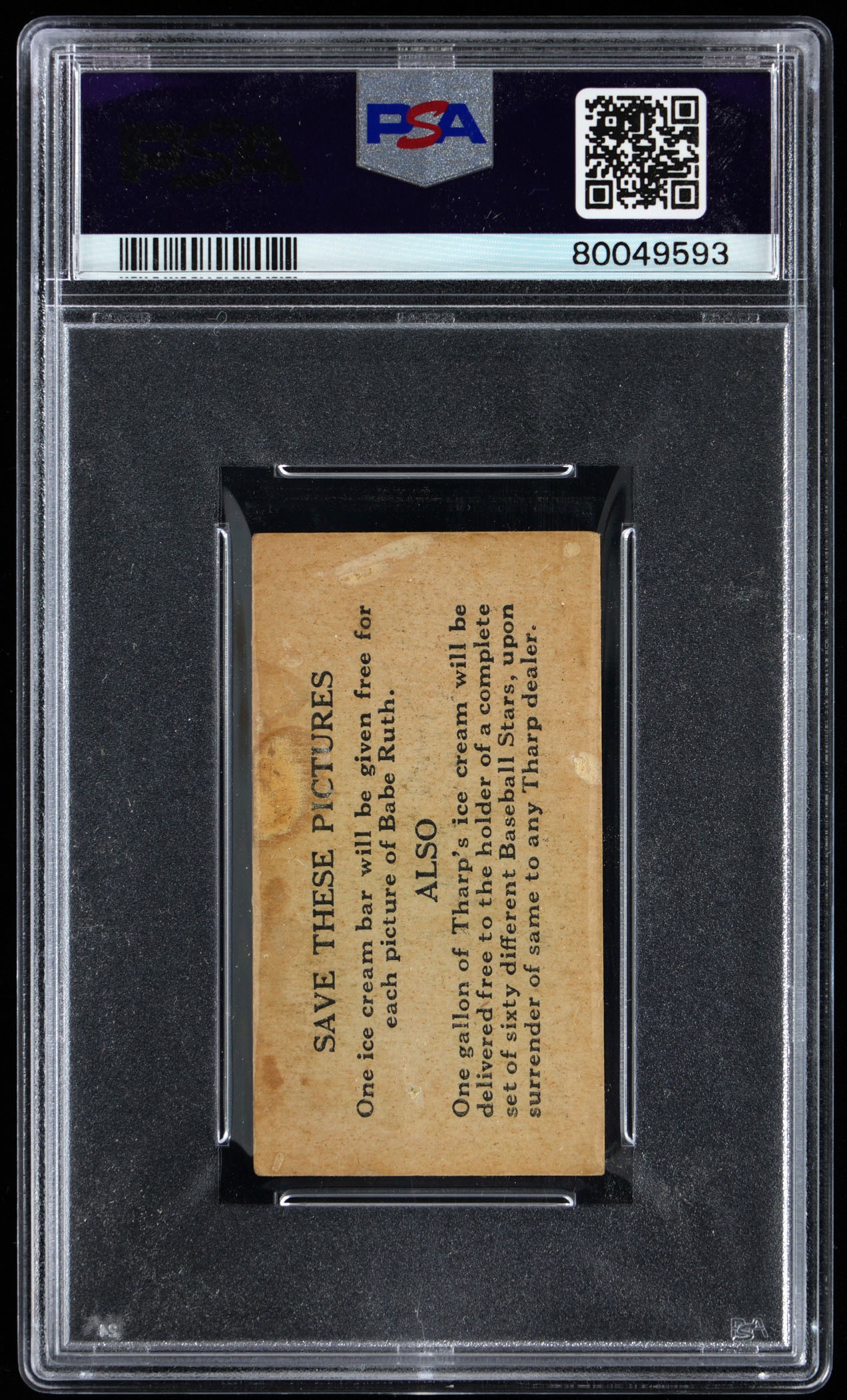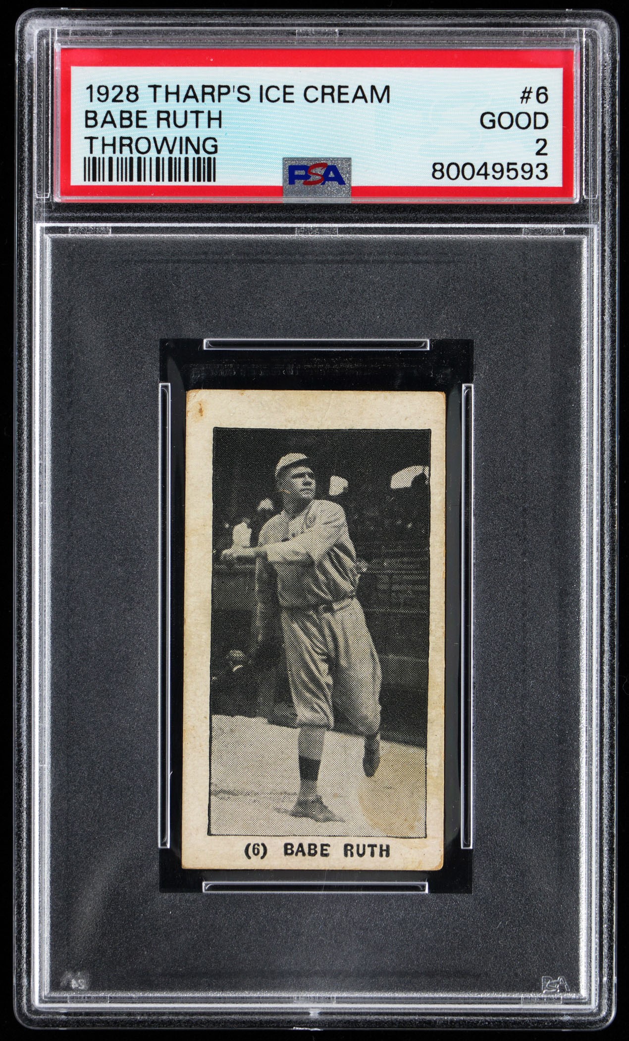 Only 4 Graded! Graded GOOD 2 by PSA. Nearly a century ago, young customers were posed with a difficult choice - enjoy a free ice cream bar or keep their picture of the legendary Babe Ruth. While in 2023 the option would be clear, in 1928 fans of the Tharp's Ice Cream brand of Shamokin, Pennsylvania would understandably be more torn. Consigned to Huggins & Scott at the National Sports Collectors Convention in Chicago, the offered 1928 Tharp's Ice Cream #6 Babe Ruth (Throwing) pose is one of the few examples of the all-time great to survive the promotional campaign. This black-and-white cornerstone is crease-free with only mild corner wear and a perfectly registered action pose. Despite varying levels of front/back discoloration, the overall presentation of this regional classic is not compromised. A pint-sized Ruthian relic that is mighty in value and will certainly attract serious bidding interest. Opening Bid $2,500.