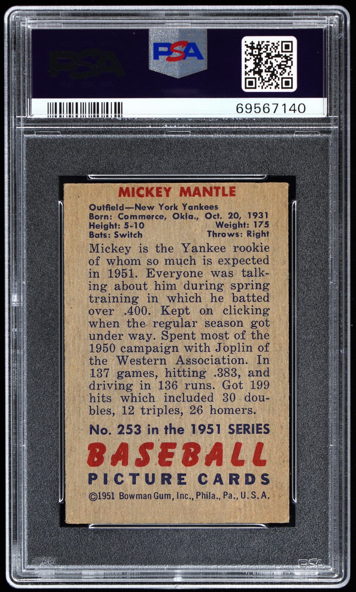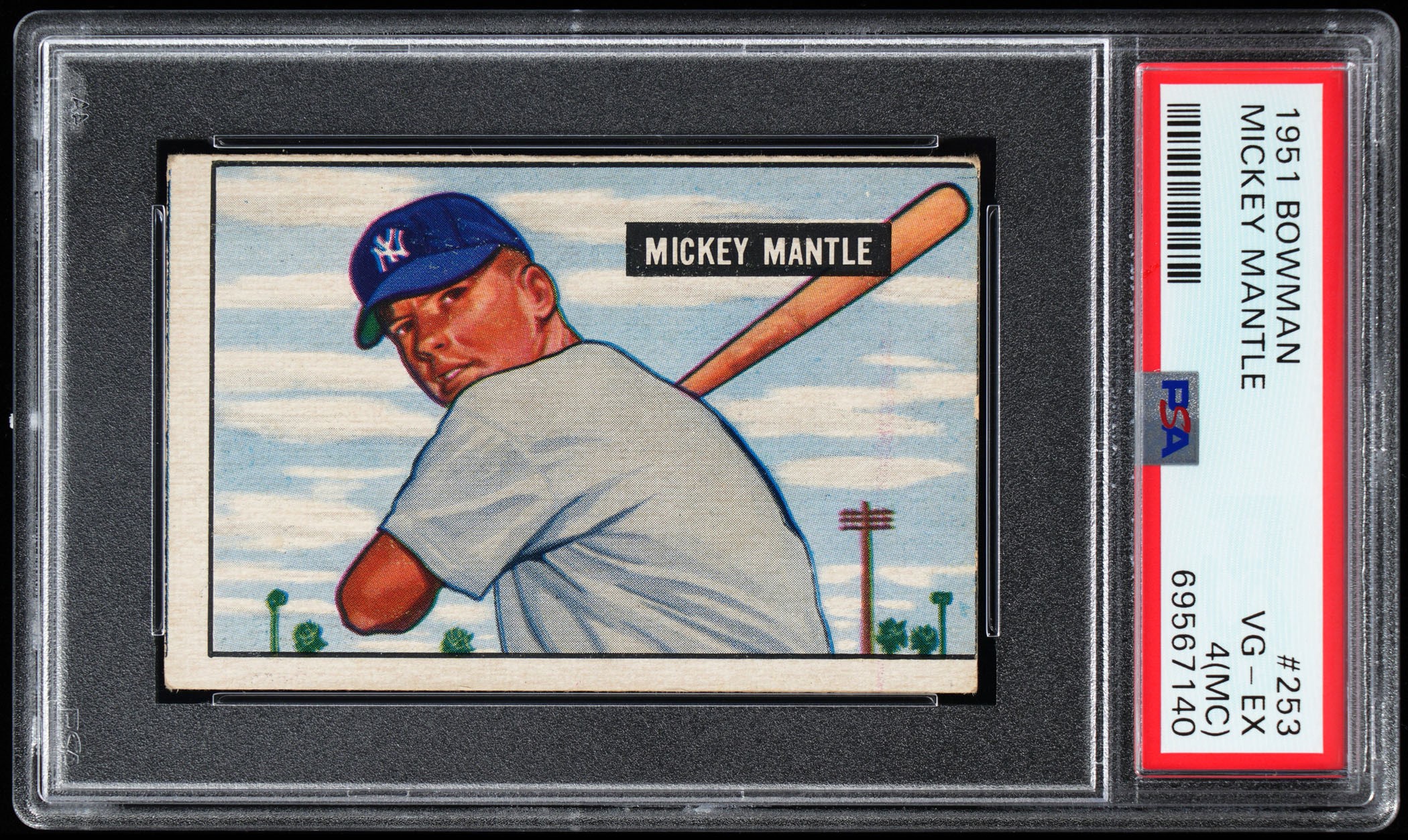 Graded VG-EX 4 by PSA with an (mc) qualifier. The offered 1951 Bowman #253 Mickey Mantle high number pre-dates the iconic 1952 Topps #311 version by a full season! This "true" rookie is crease-free with bold surface colors and only negligible perimeter wear. Despite errant factory centering, this horizontal rendering of the phenom is still perfectly contrasted with crystal clear imagery. The reverse is wax stain-free. A prime value pick! Opening Bid $2,500.