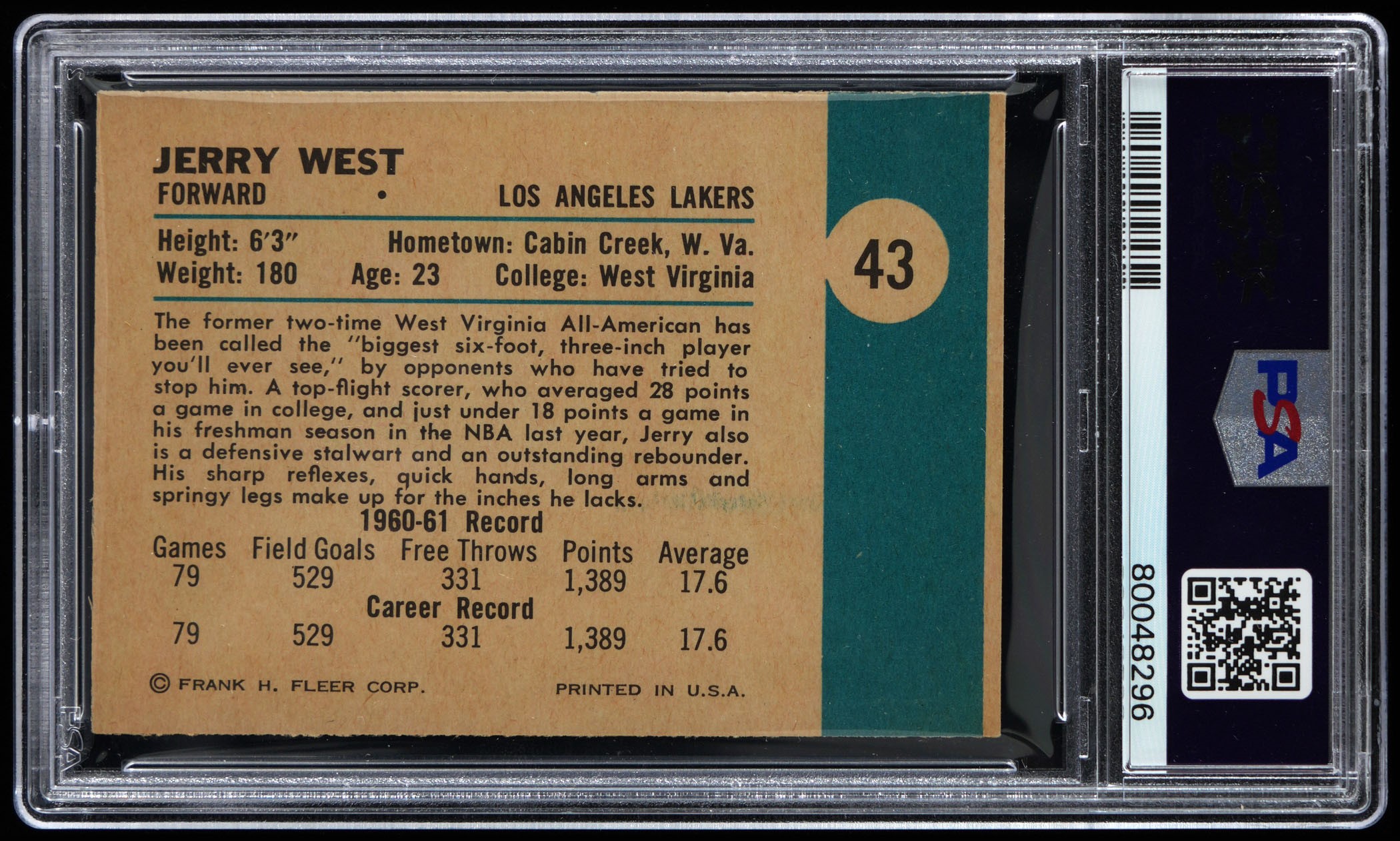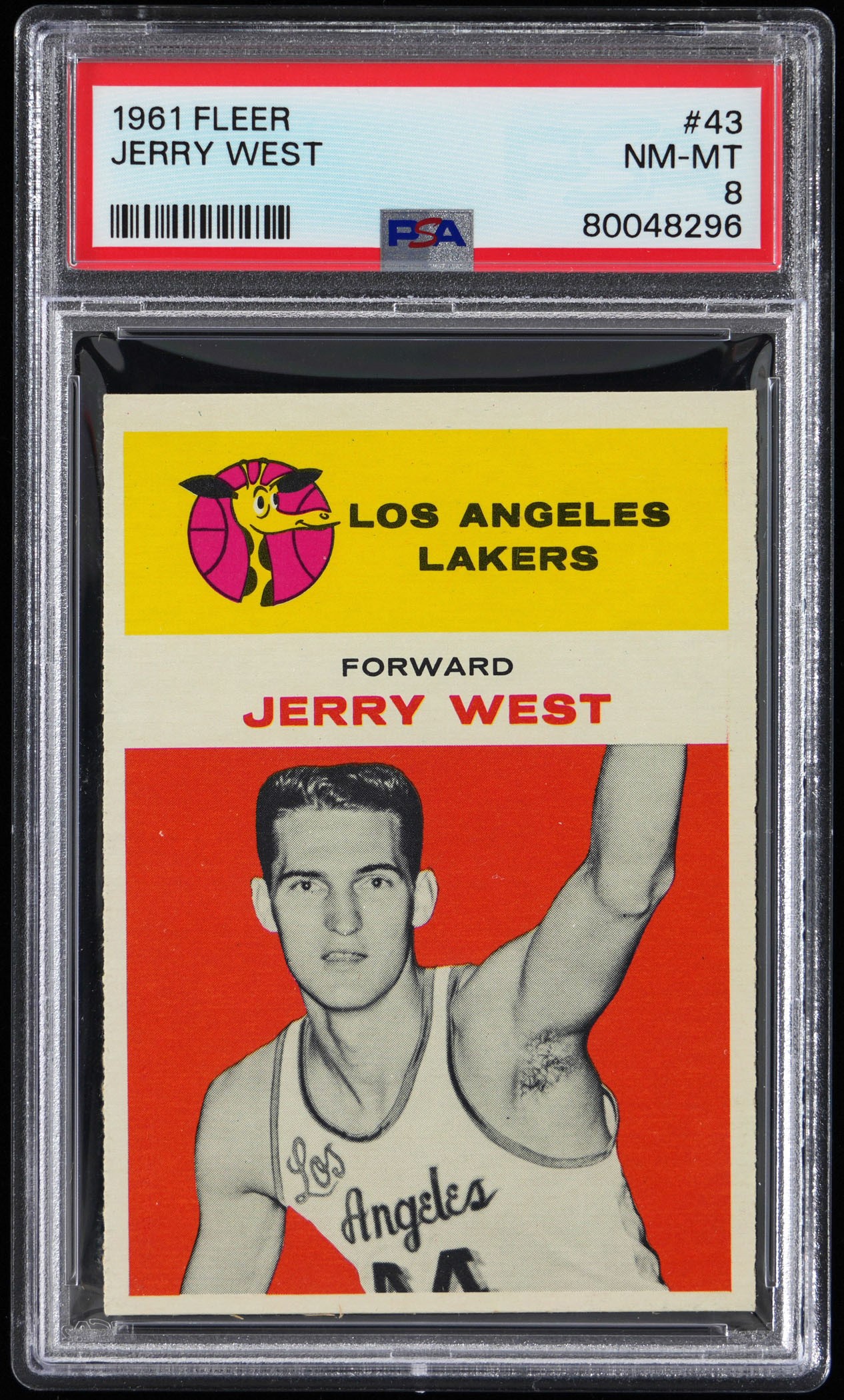An Elite Eight! Graded NM-MT 8 by PSA. Induct the offered 1961-1962 Fleer Basketball #43 Jerry West rookie into your NBA Hall of Fame rookie collection. This centered beauty showcases four barely touched corners, creamy edges and electric surface hues. The reverse which details West's collegiate exploits is problem-free. Ranks in the upper 11% of all similar copies judged by the authenticator. Opening Bid $4,000.
