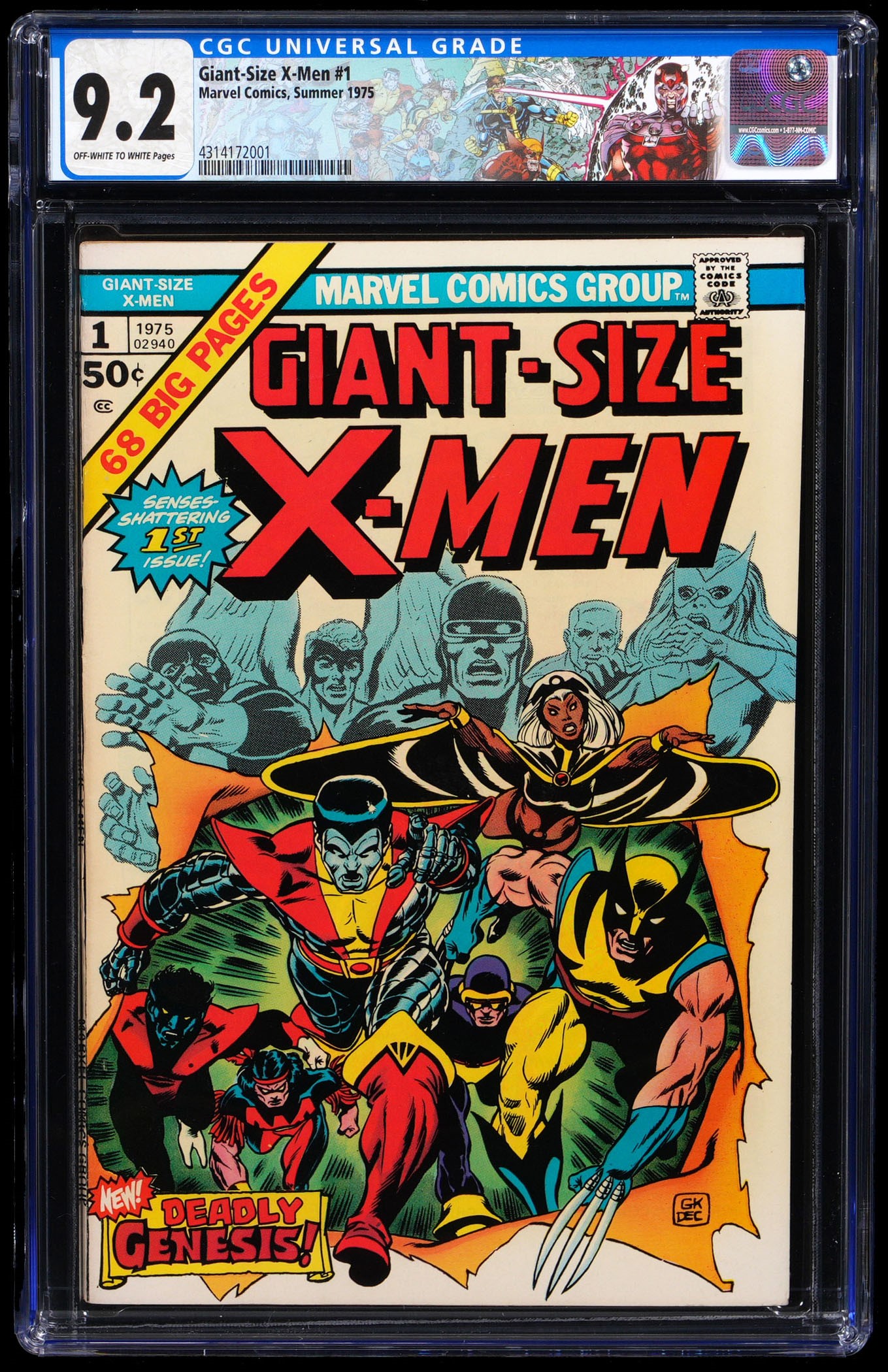 Marvel's Giant-Size X-Men #1 issue has maintained a firm spot on the "Top 25 Bronze Age Comics" list, for decades now. Released in the Summer of 1975, this major key issue comic is prized far and wide for showcasing the first appearance of the "New X-Men" team. The original X-Men series went dormant in 1970, after issue #66, with Marvel publishing only reprinted stories in issues #67 through #93. This Giant-Size #1 issue revitalized the title, as a lead-in to X-Men #94, by introducing the new team of Storm, Nightcrawler, Colossus, and Thunderbird. This mega-key issue also marked the second full appearance of the wildly popular character, Wolverine. Here we have a very attractive example of the 1975 Giant-Size X-Men #1 comic, graded 9.2 by CGC, with an "Off-White to White Pages" notation. Printed on the back of the CGC custom label is "Len Wein story, Dave Cockrum art, Gil Kane & Dave Cockrum cover, 1st appearance of new X-Men, Storm, Nightcrawler, Colossus, and Thunderbird, 2nd full appearance of Wolverine". Opening Bid $2,500.