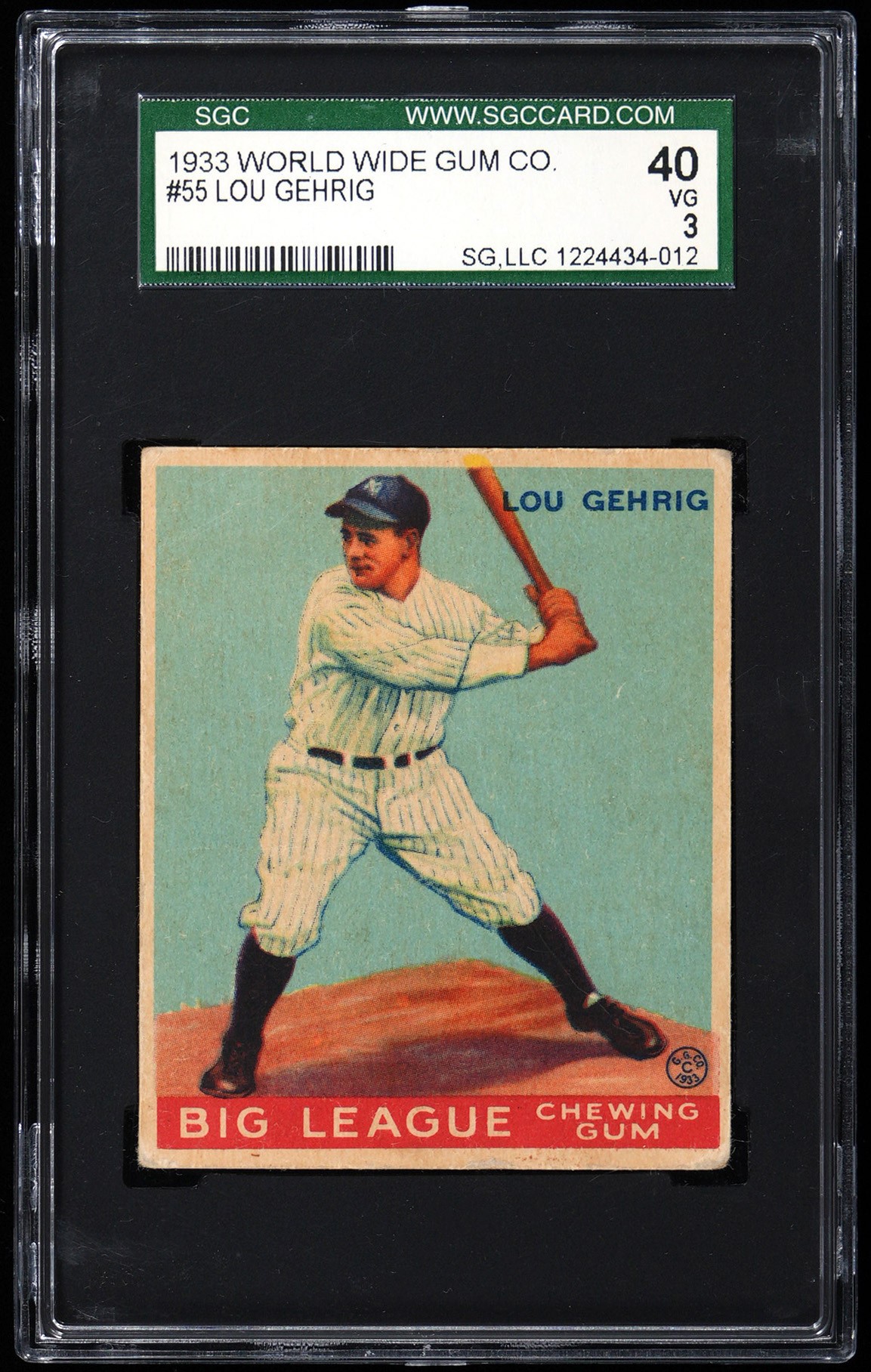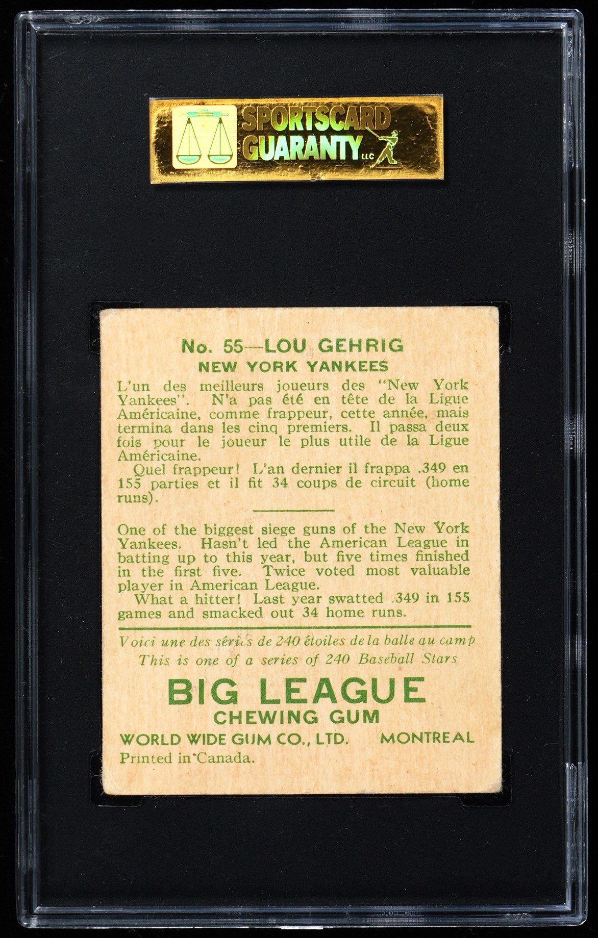 Graded VG 3 by SGC. "Murderer's Row" alum Lou Gehrig strides into an unfortunate pitch on the offered 1933 World Wide Gum #55 example. This Canadian Goudey parallel is an inspired choice for pre-war specialists as the New York Yankees slugger is properly centered with moderate, but not excessive corner wear and crisp edges. Despite limited foxing, the surface is otherwise crease-free with a clean bilingual green text advertising back. Only 46 total examples of this Goudey parallel have been judged by SGC. Compare that to the 1,170 combined total from Gehrig's two 1933 Goudey poses and the value of this Canadian classic becomes much more evident. Opening Bid $1,000.